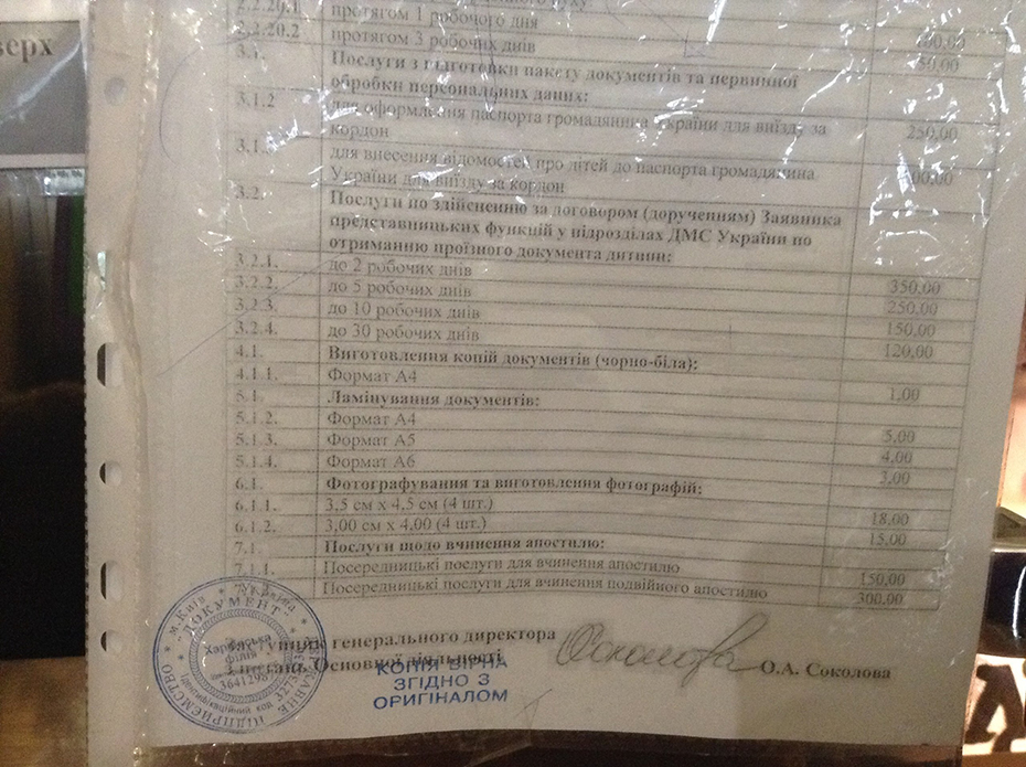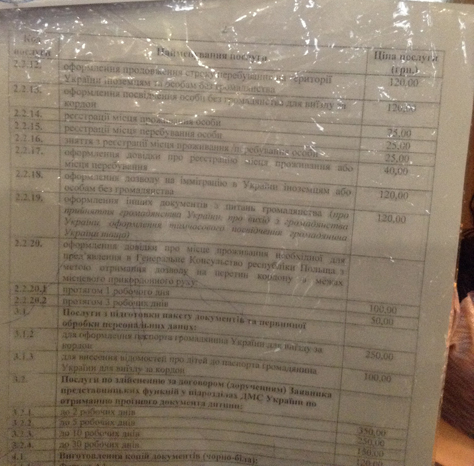 Выходит, что 135 гривен (не считая комиссии) Иван заплатил предприятию «Документ», сам об этом не подозревая. О том, что за услуги «окошка» нужно дополнительно платить, его, как и всех, кто был в очереди, — устно — не предупредили. А кто в таких условиях обратит внимание на распечатки с расценками, теряющиеся на фоне других объявлений?