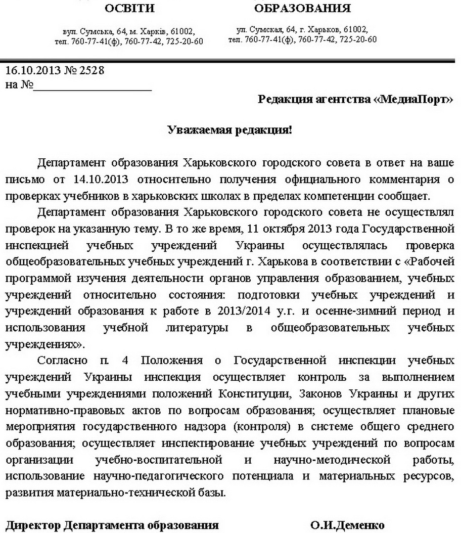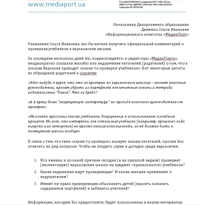 Естественно, я попыталась выяснить подробности этих «непонятных проверок» у чиновников. В городском Департаменте образования меня попросили сформулировать вопросы письменно. Собственно, вот письмо от «МедиаПорта».
