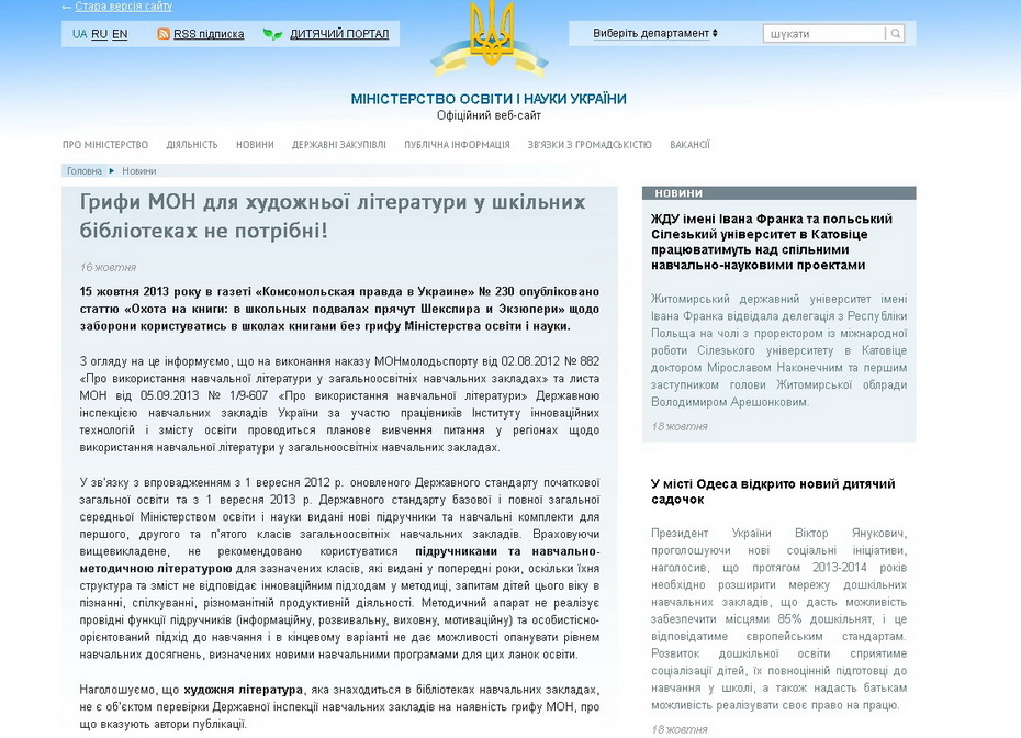Тем, кто ничего не понял, могу предложить объяснение уровнем выше. Министерство образования и науки Украины после публикации материала в одной из газет выдало на официальном сайте следующее: проверки школьных учебников — это «плановое изучение вопроса в регионах». Учебная программа изменилась, поэтому комплекты учебников для 1-х, 2-х и 5-х классов, изданные до 2012 года, «не рекомендованы»(!).