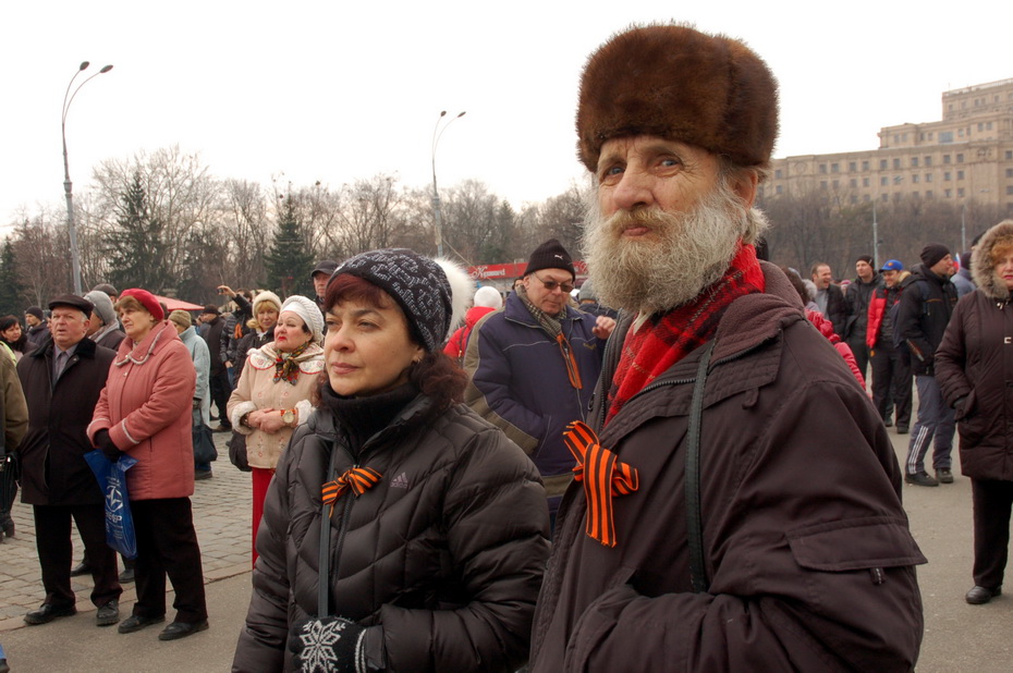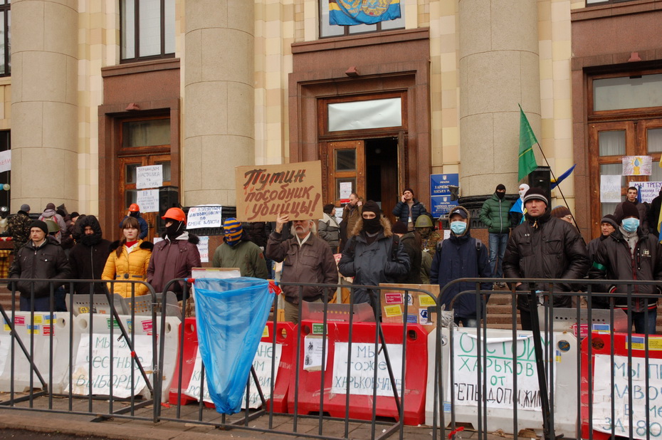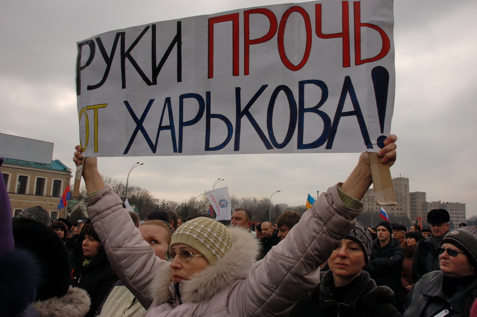 На площади Свободы в Харькове проходит митинг «патриотично настроенных харьковчан». Несколько тысяч людей слушают выступающих со сцены Геннадия Кернеса, Аллу Александровскую, советских офицеров и других спикеров. Многие собравшиеся украшены георгиевскими лентами, несколько человек держат флаги России.