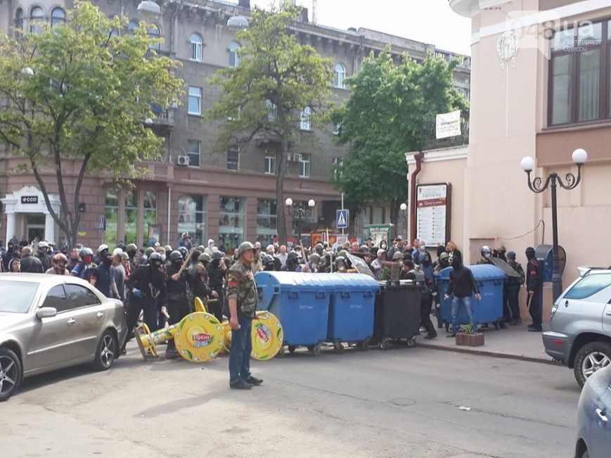 Сообщения одесских СМИ позволяют составить представление об арсенале противоборствующих сторон. По данным «Сайта города Одессы», у сторонников России было травматическое оружие. Корреспондент портала сообщил также, что «у сторонников России есть автоматы Калашникова, они стреляют». Издание пишет, что на Греческой демонстранты разливали «коктейли Молотова». Корреспонденты сайта «O1» сфотографировали человека с георгиевской ленточкой, который с крыши торгового центра стрелял из пистолета по «евромайдановцам».