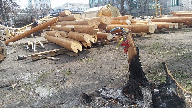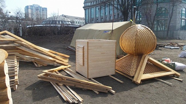 Деревянный купол, брёвна и кресты — стройматериалы для будущей часовни вчера, 24 марта, привезли на Майдан. Часовню в память о «Небесной сотне» решили установить трое «майдановцев». Все они — мастера по деревянной резьбе, родом из Закарпатья.