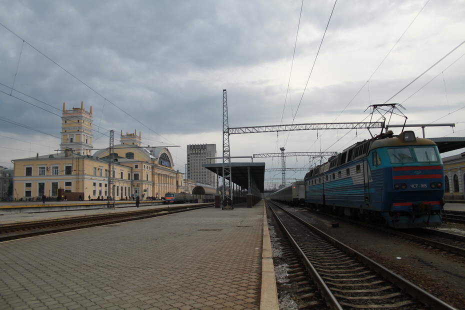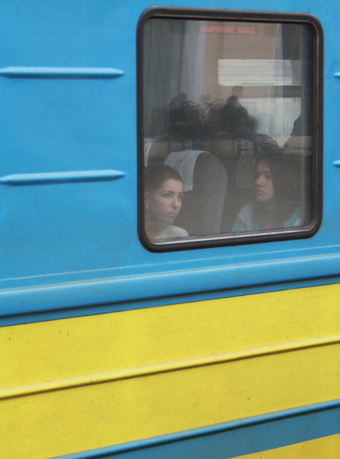 Внутри вагонов прибывшего поезда — сидячие кресла, по несколько в каждом ряду. Это бывший «Столичный экспресс» — такие поезда ходили из больших городов страны в Киев до появления Hyundai.