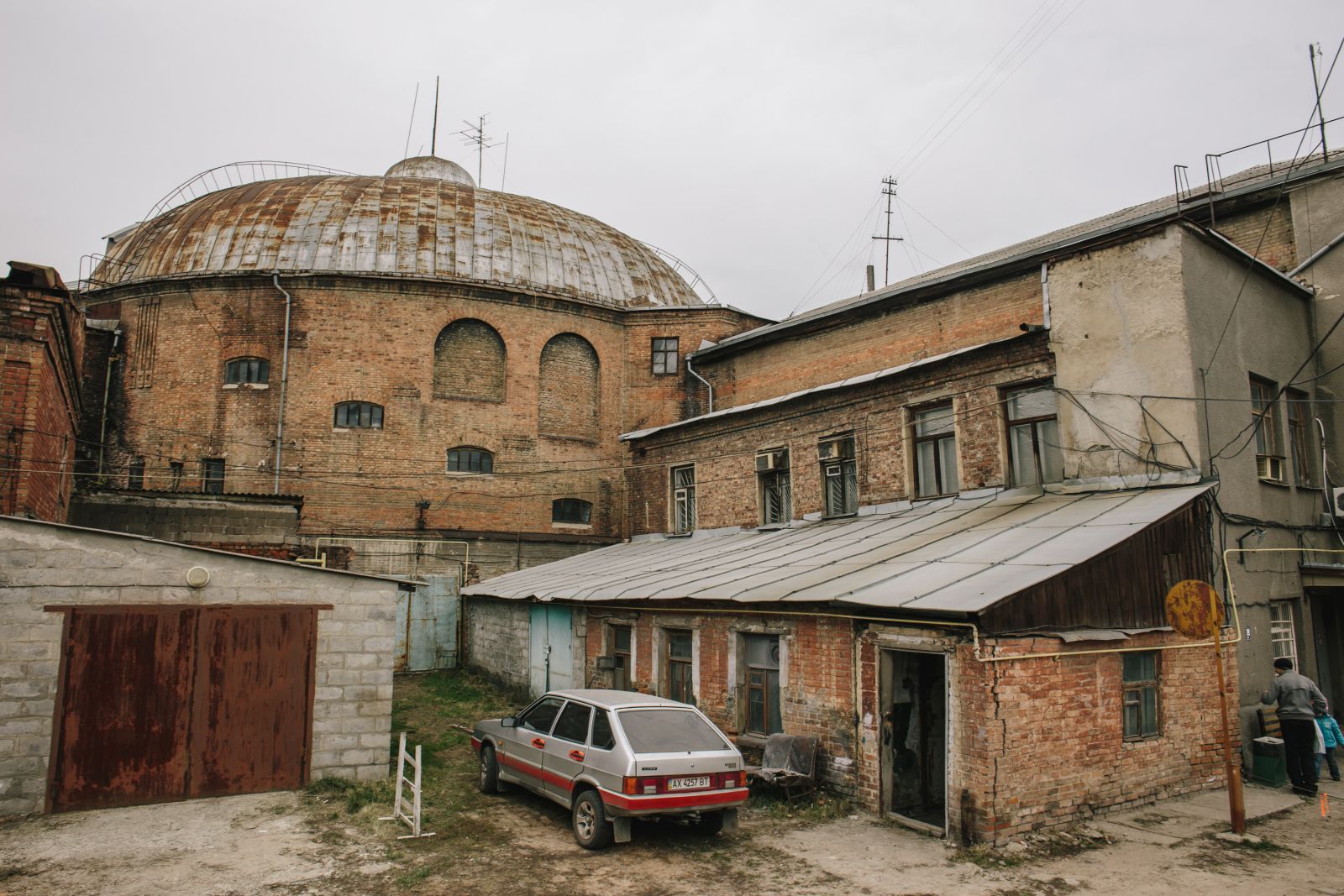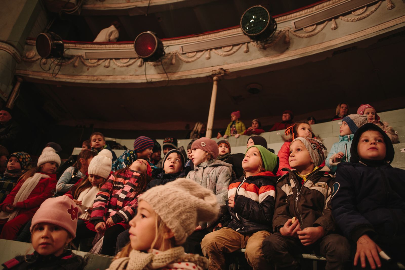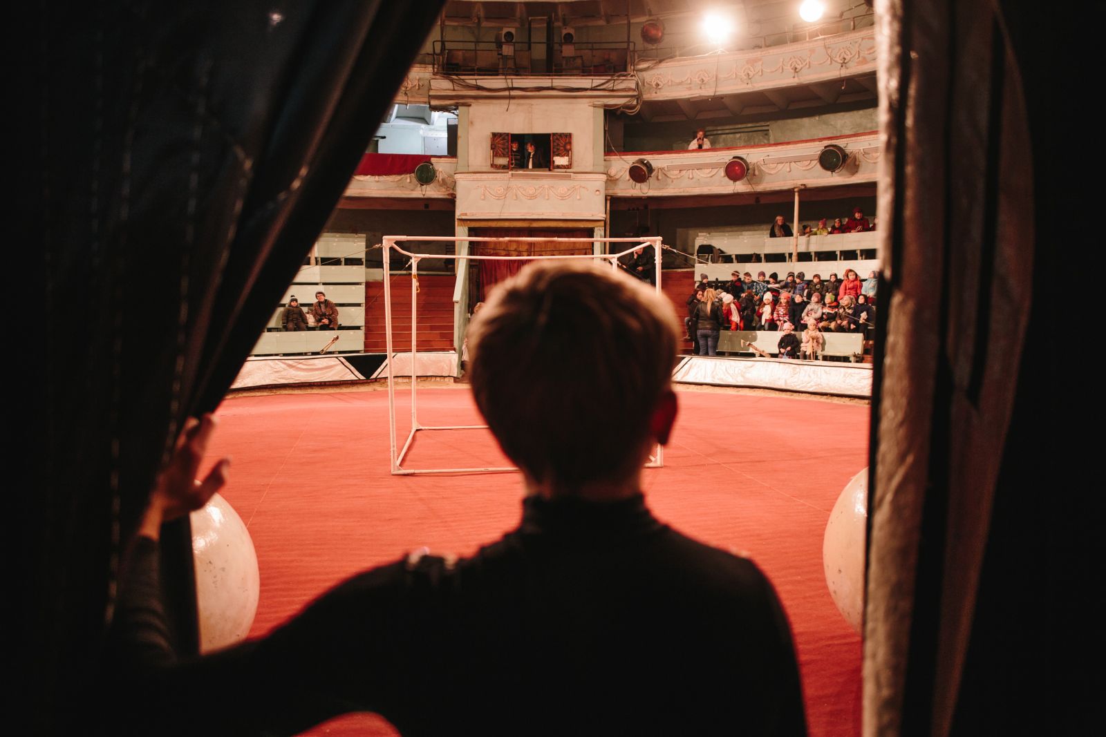 Здание Старого цирка почти не видно с улицы — его закрывают собой многочисленные кафе и СТО. Внутри так же мрачно — в помещении едва доходит до +15, вокруг бегают дети в свитерах. Впрочем, холод не мешает ребятам готовиться к концерту.