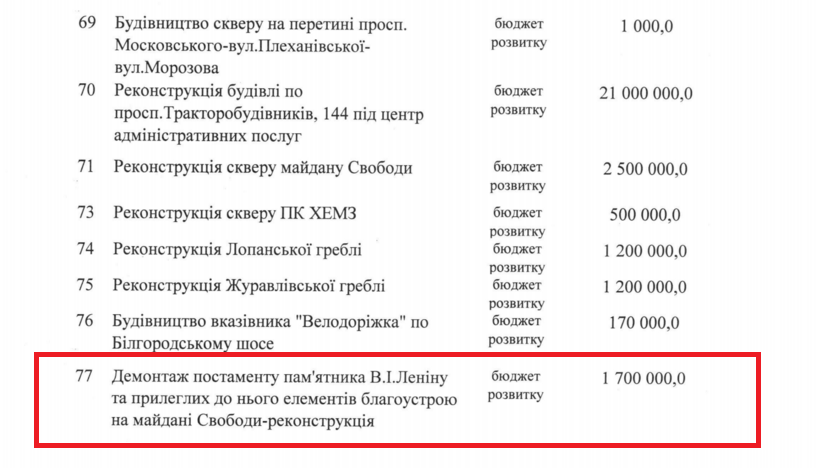 На «демонтаж постамента памятника Ленину и прилегающих к нему элементов благоустройства» заложили сумму в 1 700 000 гривен.