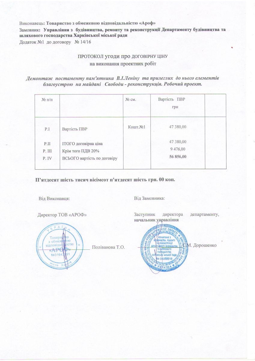 Пользователь сайта «Доступ к правде» Марина Соколова на информационный запрос получила ответ с названием фирмы, которой поручили изготовить проектную документацию демонтажа постамента. Это ООО «Ароф» во главе с архитектором Татьяной Поливановой, одним из авторов проекта реконструкции площади Конституции и других объектов в городе Харькове. Договор на выполнение проектных работ, исходя из документов, заключён на сумму 56 856 гривен.