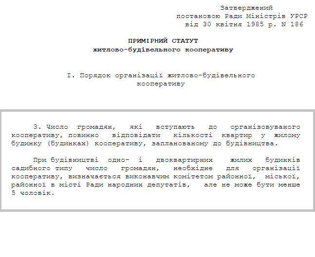 Пунктом 3 Типового устава предусмотрено, что «число граждан, которые вступают в кооператив, должно соответствовать количеству квартир в жилом доме (домах) кооператива, запланированному к строительству», а «при строительстве одно- или двухквартирных жилых домов усадебного типа число граждан, необходимое для организации кооператива, определяется исполнительным комитетом районной, городской, районном в городе Советом народных депутатов, но не может быть меньше пяти человек».