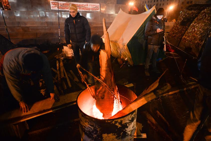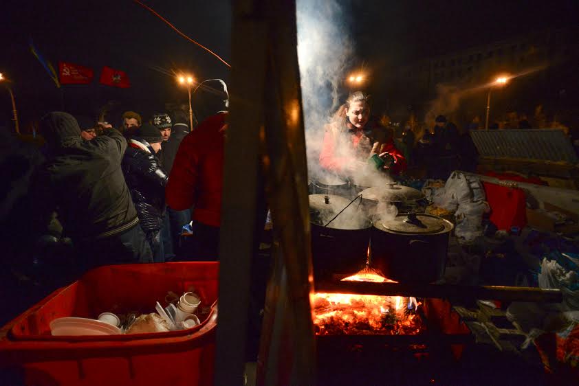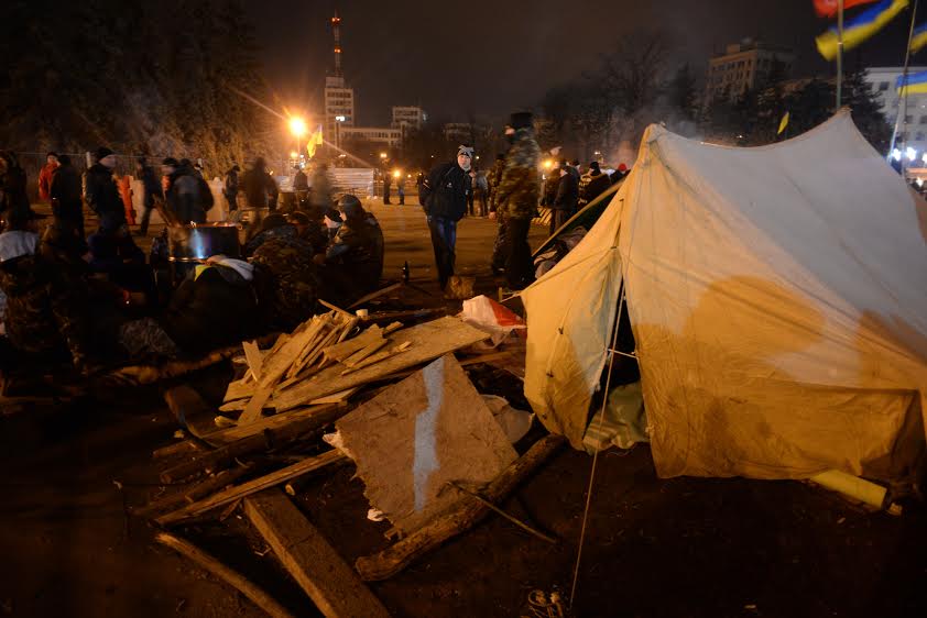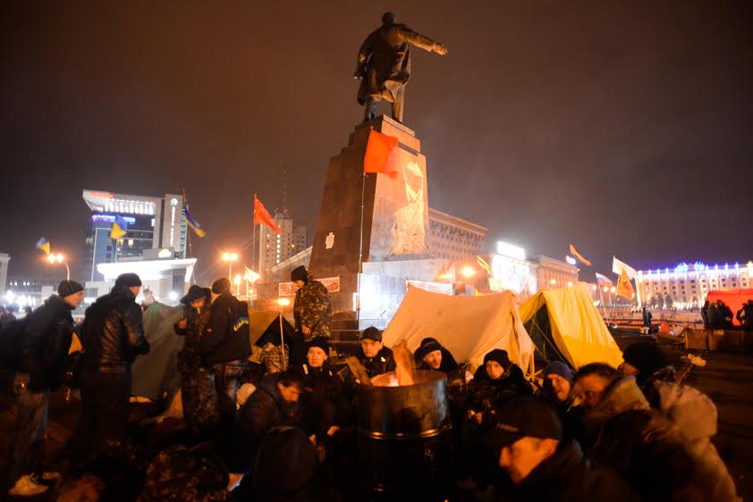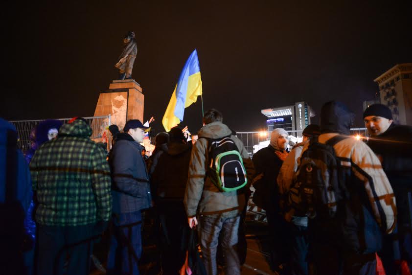 В воскресенье, 23 февраля, около памятника Ленину — который накануне не свергли майдановцы, хотя собирались, а вместо этого решили аккуратно демонтировать — собрался митинг, к понедельнику превратившийся в полноценный лагерь.