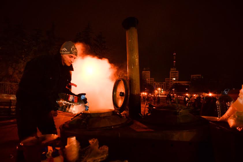По углам постамента — бочки, в которых разведены костры для обогрева людей.