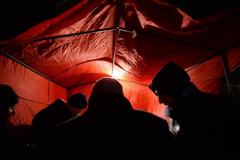 Жизнь в лагере шла почти так же, как и несколько часов назад, только стало тише. Защитники Ленина ужинают, сбившись в группки травят байки, кто-то приносит продукты, дрова. Александр показывает нам, что где в лагере.