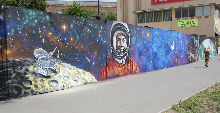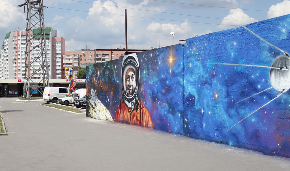 Граффитчики из арт-студии «Ку2» разрисовали стену на проспекте Гагарина. На шести плитах они изобразили «кусочек» космоса и советского космонавта Юрия Гагарина.