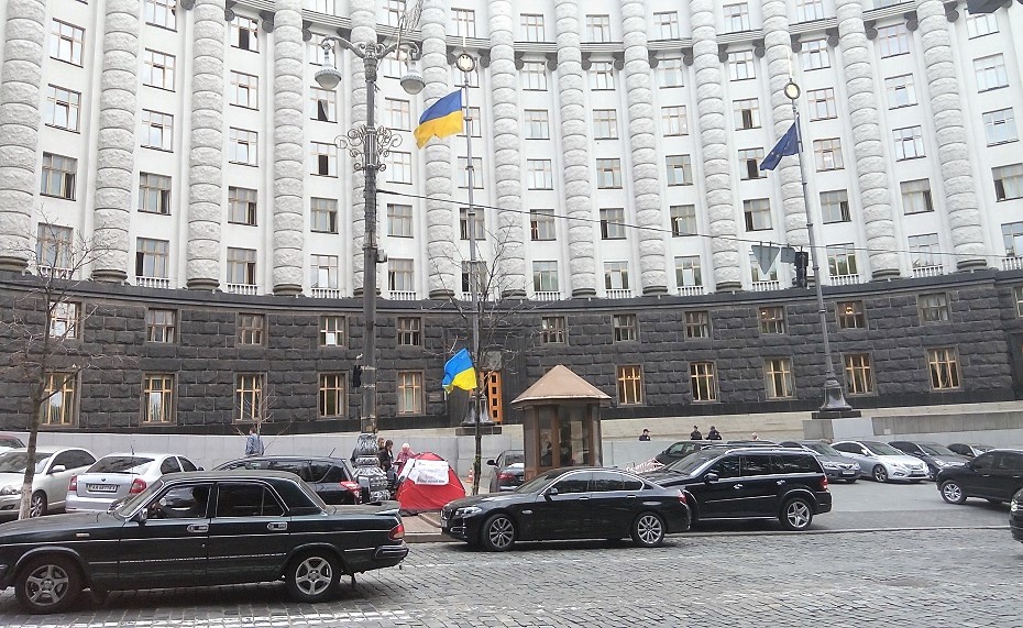 Будничный пейзаж перед зданием правительства с понедельника дополняет красная палатка. Рядом рабочие перекладывают тротуар. Шумно — машин на улице Грушевского много и по ночам, не говоря уже о разгаре дня.