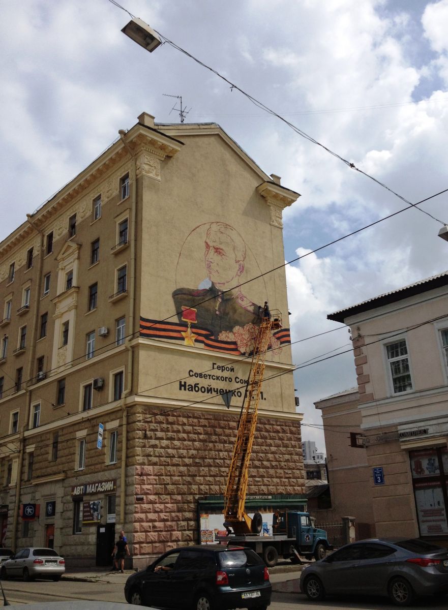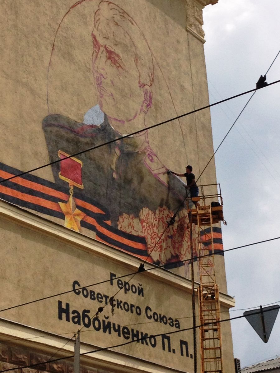 Ещё одна группа художников — из компании «Кайлас-В», работает над портретом Героя Советского Союза Петра Набойченко. Граффити заказала администрация Октябрьского района Харькова.