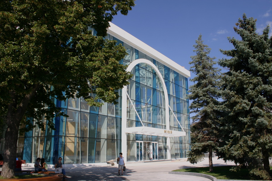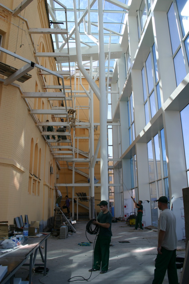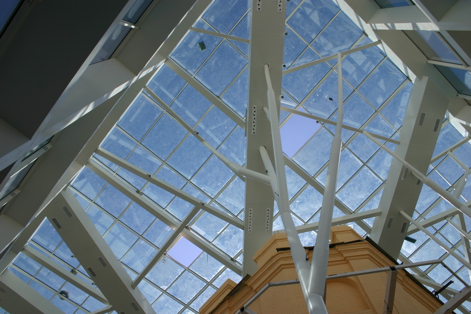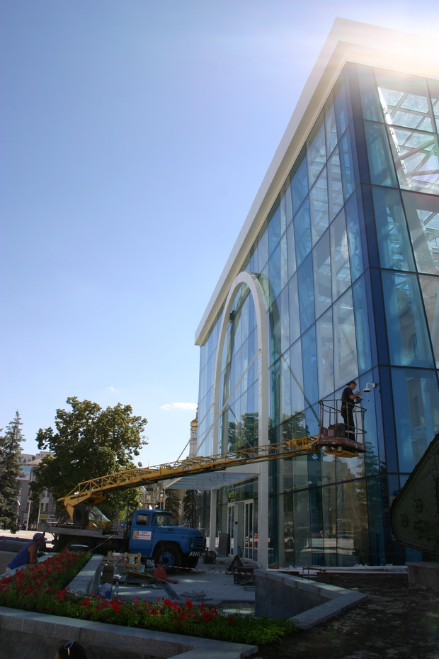 Стеклянную пристройку Исторического музея мыть и натирать накануне праздников рабочие не будут — внутри «стеклянного колпака» идёт стройка. Сейчас электрики развешивают светильники. Всё здание будут освещать почти 200 ламп.
