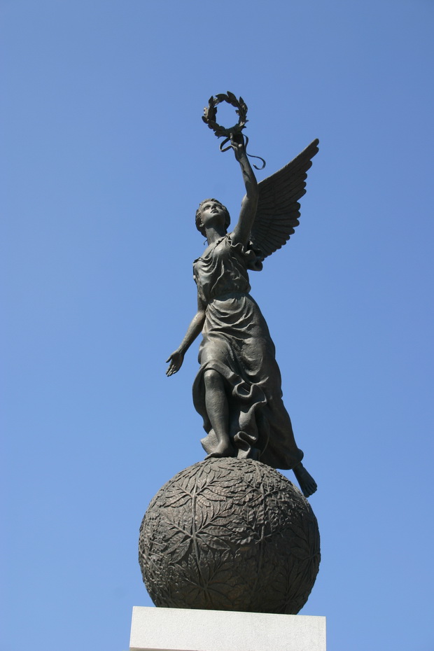 Памятник на площади Конституции — Монумент Независимости, который ровно год назад открывал Янукович, — к приезду гаранта рабочие помыть успели, а вот полировать «бронзовую женщину на шаре» будут уже после праздников.