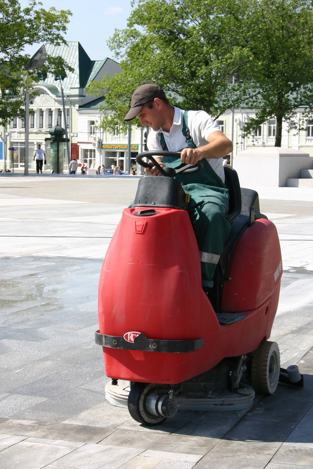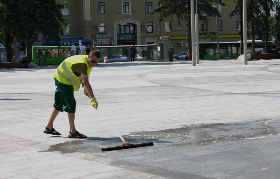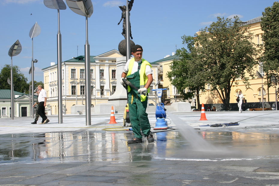 Всю площадь Конституции моет бригада из четырёх человек. Работать будут даже сегодня ночью, чтобы успеть ко Дню города и приезду президента.