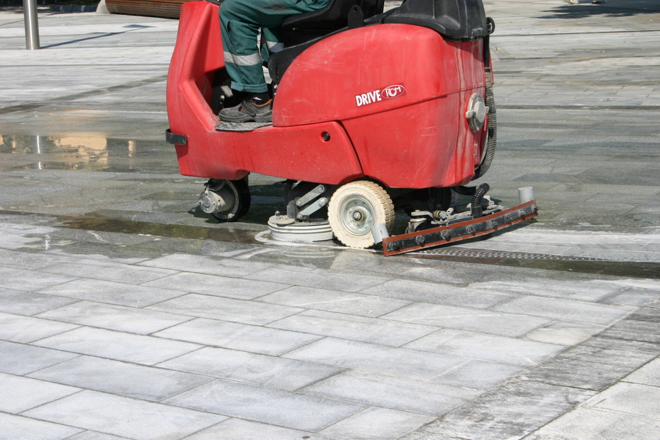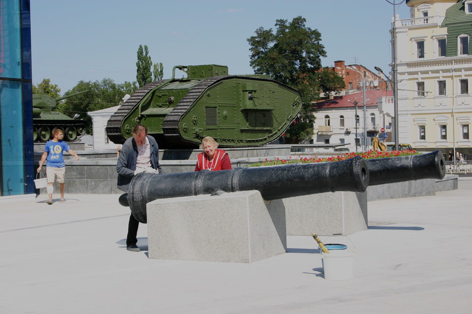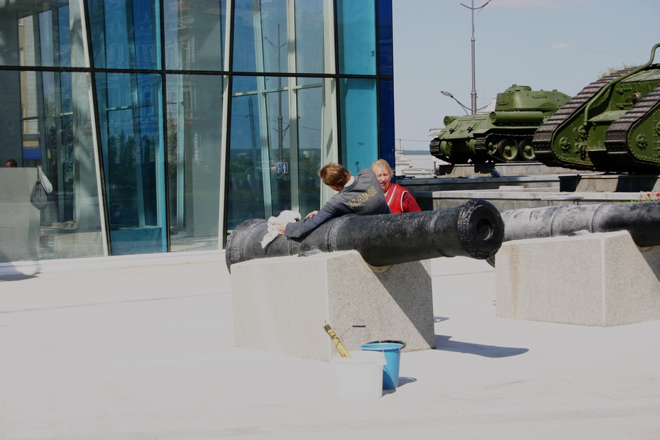 С самого утра на площади Конституции рабочие начищают пушки возле здания обновлённого Исторического музея. После строительных работ площадь измазана цементом. Чтобы удалить его, нужно покрыть камень специальным раствором, прочистить щётками и сразу же смыть водой, поясняет мойщик Евгений.