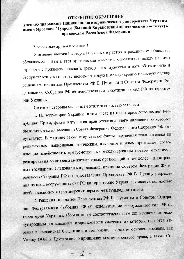 Учёные-правоведы Национального юридического университета Украины имени Ярослава Мудрого подписали открытое обращение к правоведам Российской Федерации. Авторы отмечают, что решение Совета Федерации РФ о вводе в Украину войск — необоснованно и не отвечает международным соглашениям. Кроме того, учёные подчёркивают: Верховная Рада — полностью легитимный орган, её решения, а также решения органов государственной власти Украины, связанные с внутриполитическими событиями в Украине, — внутреннее дело Украины и украинского народа.