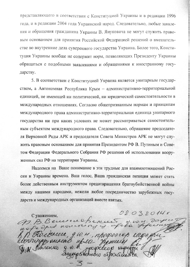 Учитывая высокий авторитет учёных-юристов в российском обществе, обращаемся к Вам в этот критический момент в отношениях между нашими странами с призывом проявить гражданское мужество и дать объективную и беспристрастную конституционно-правовую и международно-правовую оценку решениям, принятым Президентом РФ В. Путиным и Советом Федерации Федерального Собрания РФ об использовании Вооружённых Сил РФ на территории Украины.