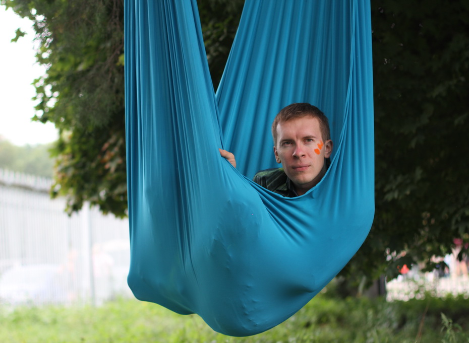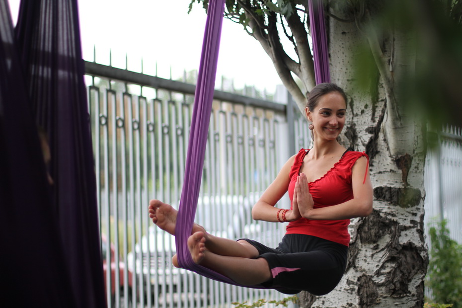 «Флай-йога сочетает йогу и акробатику, — рассказывает Юлия Андрющенко. Девушка занимается обычной йогой, а «летала» впервые. — Это новое направление, пришло из Америки. Здесь «перевёрнутые» позы, которые в обычной йоге делаются — стойка на голове, стойка на руках. В гамаке происходит вытяжение позвоночника — мы его не нагружаем. И в гамаке перевёрнутые позы делать легче и безопаснее. А эффект тот же».