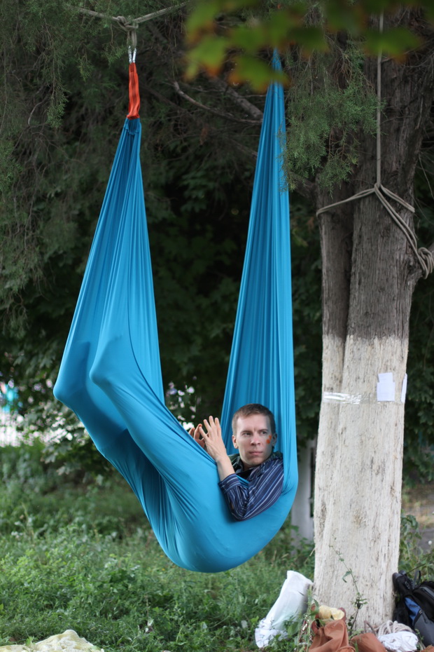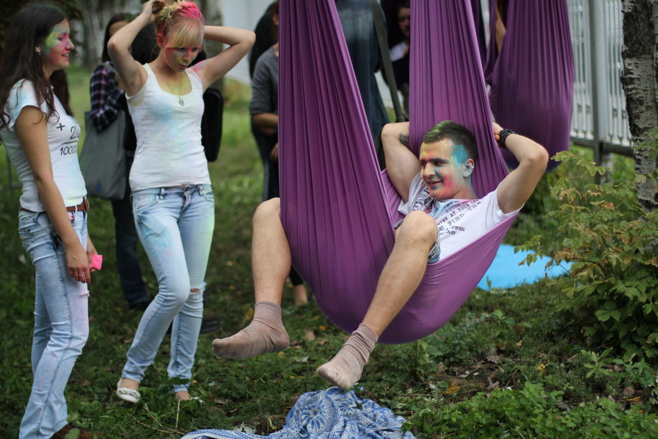 Мастер-класс по индийским танцам, индийские игры или занятие по сахаджа-йоге, — любое из этих развлечений для гостей фестиваля было бесплатным. За территорией футбольного поля — ещё одна площадка, здесь можно было «полетать». На верёвке развешены специальные эластичные гамаки, гости фестиваля в шутку окрестили их «коконами». Это приспособления для занятия флай-йогой, поясняет Евгения Хашева. Несколько месяцев назад она прошла «интенсивный курс» флай-йоги в Киеве (два дня обучения), теперь и сама учит других. Уверяет, что именно она первой привезла в Харьков «летающую йогу». От обычной йоги «летающая» отличается меньшей нагрузкой.