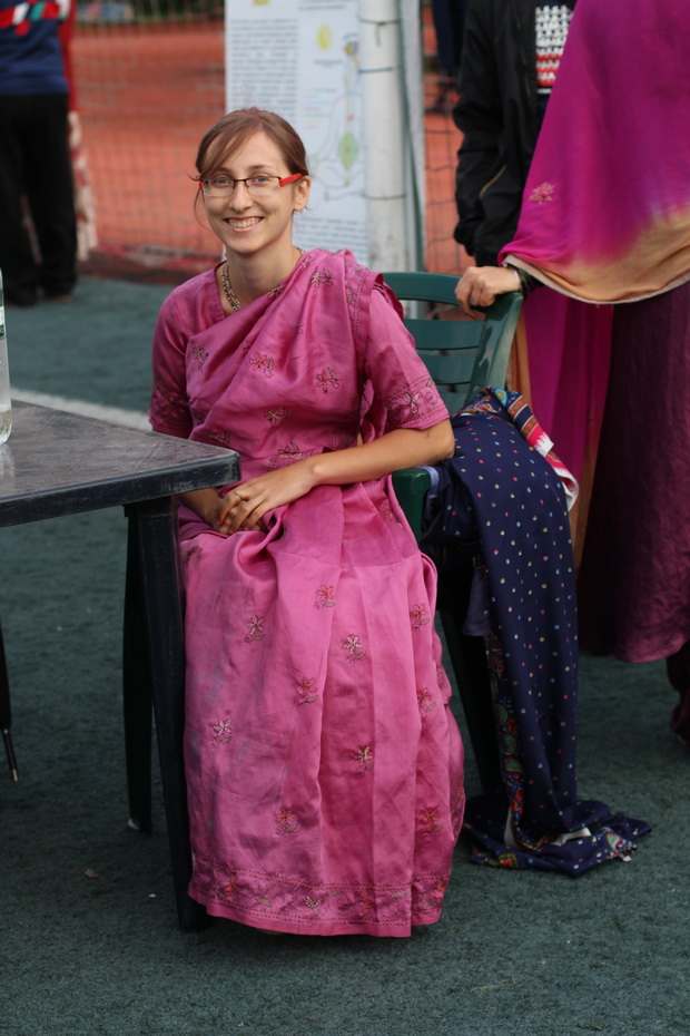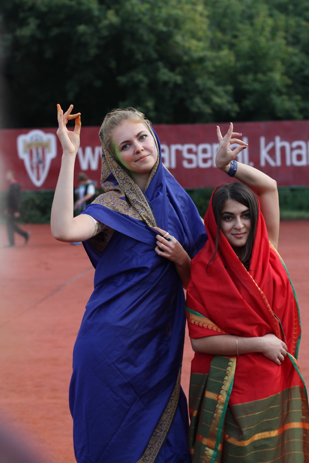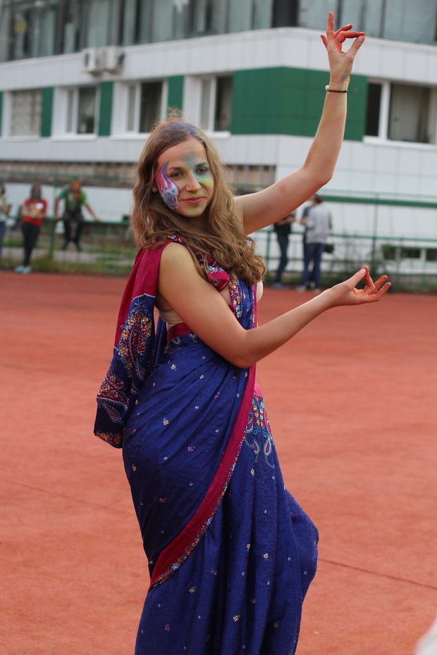 Помимо развлечений «красочных», на фестивале можно было примерить индийские наряды. Для девушек — сари, для мужчин — курта. Несколько своих индийских платьев принесла инструктор по сахаджа-йоге Ольга Ноздрачёва.