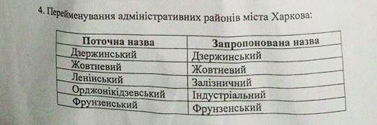 В Харькове — девять районов, из которых лишь два однозначно не попадают под переименования в связи с декоммунизацией: Киевский и Московский. Остальным семи придётся сменить название, поскольку оно имеет непосредственное отношение к коммунистическому режиму, тоталитаризму, а значит, согласно закону, не имеет права на существование. Это Дзержинский, Коминтерновский, Ленинский, Октябрьский, Орджоникидзевский, Фрунзенский и Червонозаводский.