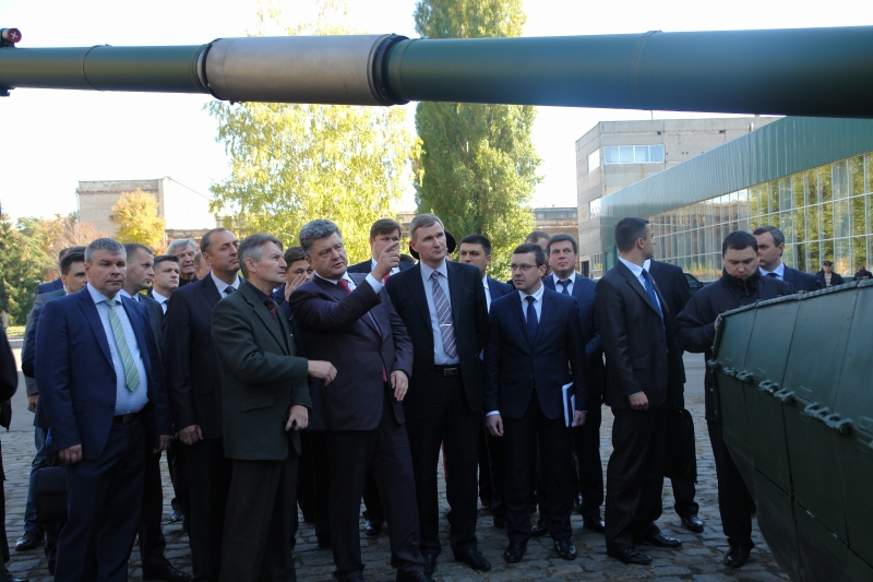 Гордость харьковских конструкторов — боевой танк «Оплот» — главе государства демонстрируют вместе с другими бронемашинами. Тщательнее всего Порошенко рассматривает бронетранспортёры, которые используются в зоне АТО. Разработчики не успевают отвечать на вопросы президента.