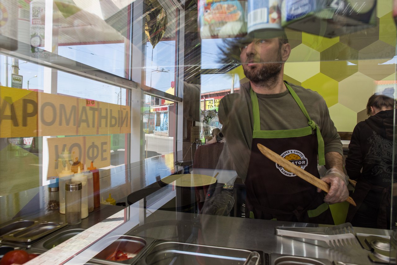 Алексей и Надежда — тоже переселенцы. До 2014 года супруги жили в родном городе Надежды — Харцызске Донецкой области. Переехали в Харьков и со временем, также при поддержке благотворителей, открыли бизнес — блинную.