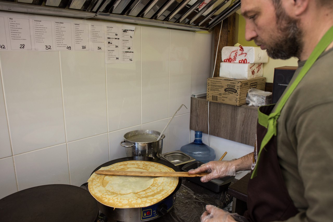 На кухне маленького заведения Алексей и Надежда Матухно по очереди жарят и заворачивают блины. Они готовят начинку, выливают тесто на специальную блинницу, одной лопаткой ровняют, другой переворачивают.