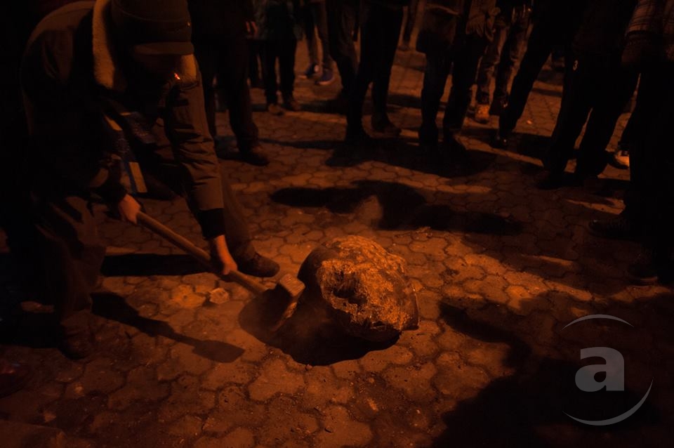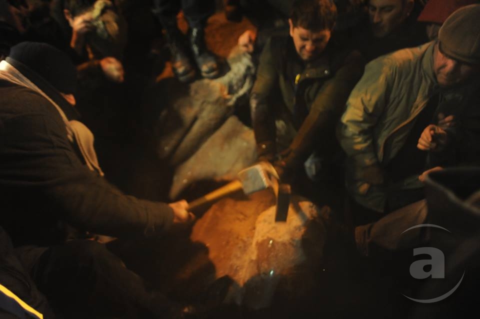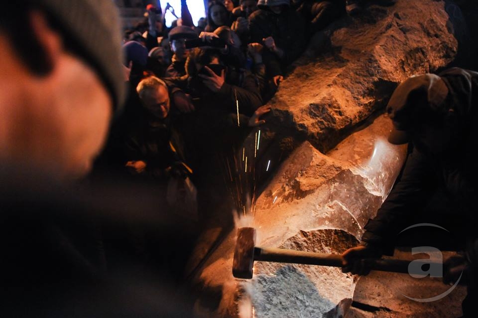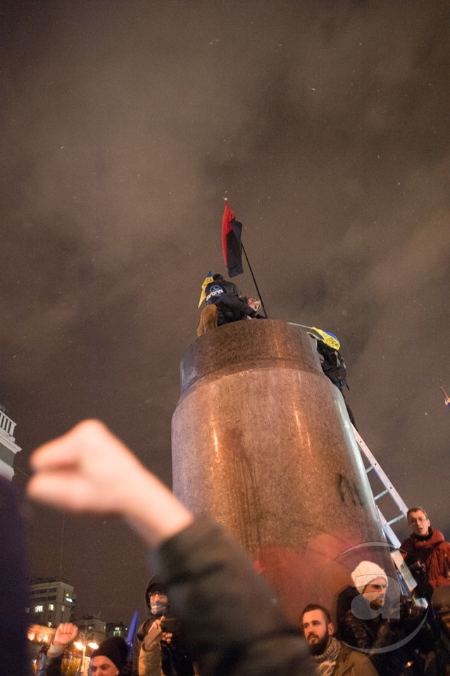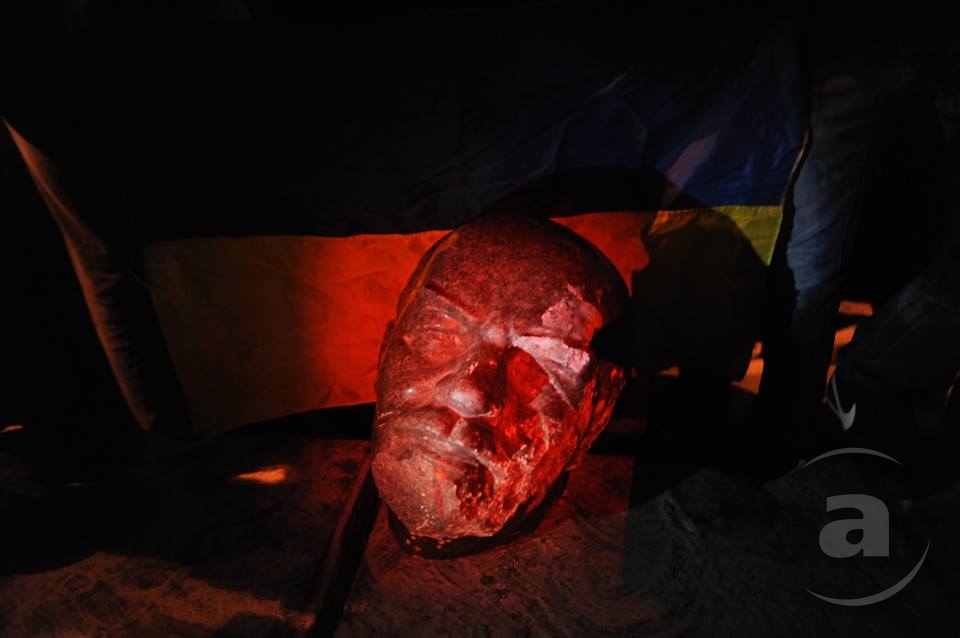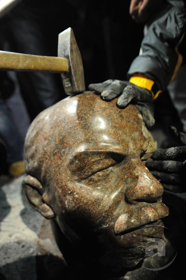 Памятник Ленину в Киеве упал с постамента за десять секунд. После — те, кто снёс памятник, ушли — и началась другая «акция». Не меньше шести часов люди делили Ленина на части.