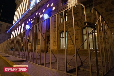 Готовиться к акциям протеста в КГГА начали накануне вечером. Здание окружили металлическим забором, внутри и снаружи выстроились сотрудники спецподразделения «Беркут».