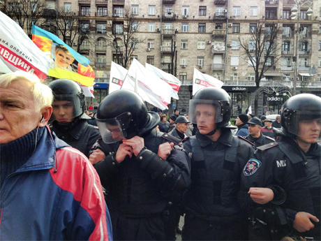 Толпу, которая прорывалась в Киевсовет, сдерживали внутренние войска. Люди кричали «Украина превыше всего, милиция с народом, а мусора с уродом».