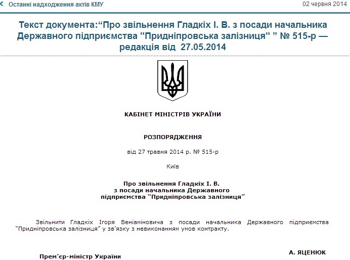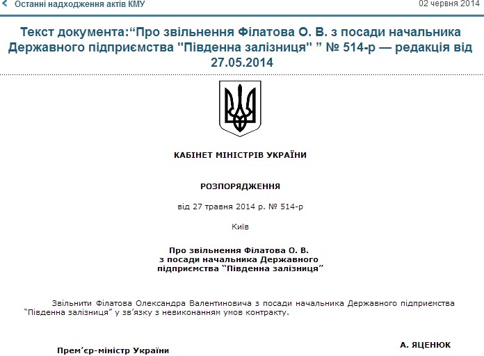 Начальник Государственного предприятия «Южная железная дорога» Александр Филатов и начальник Приднепровской железной дороги Игорь Гладких уволены из-за «невыполнения условий контракта».