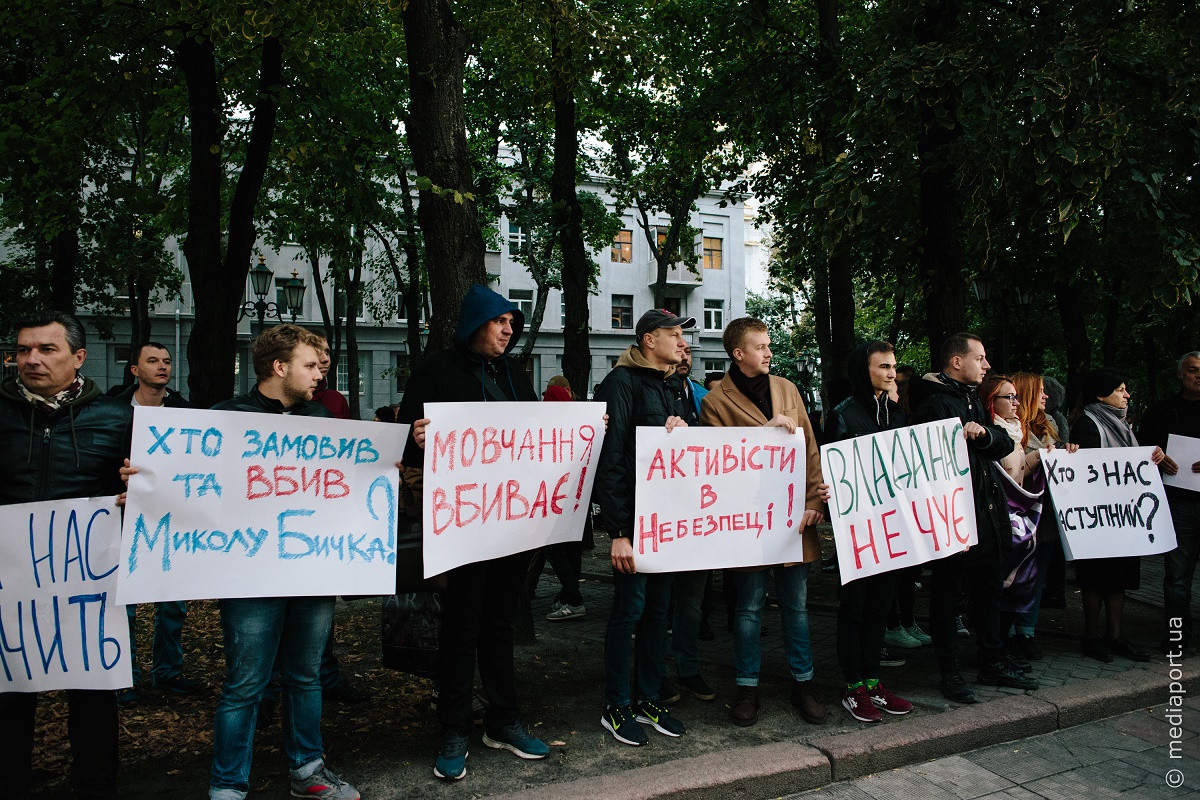 Участники акции держали плакаты: «Кто заказал Николая Бычко?», «Молчание убивает», «Власть нас не слышит», «Кто из нас следующий?».