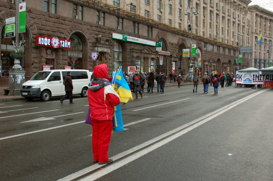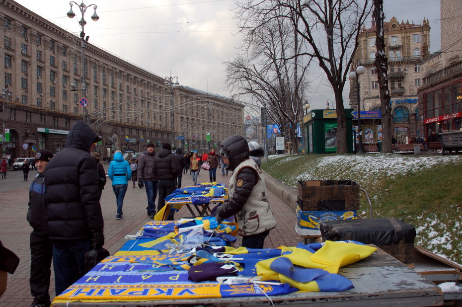 Крещатик. Продавцы флажков и знамён ликуют. У них 8 Марта и Новый год в одном флаконе. Цена национального символа от 15 до 60 гривень.