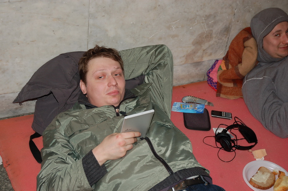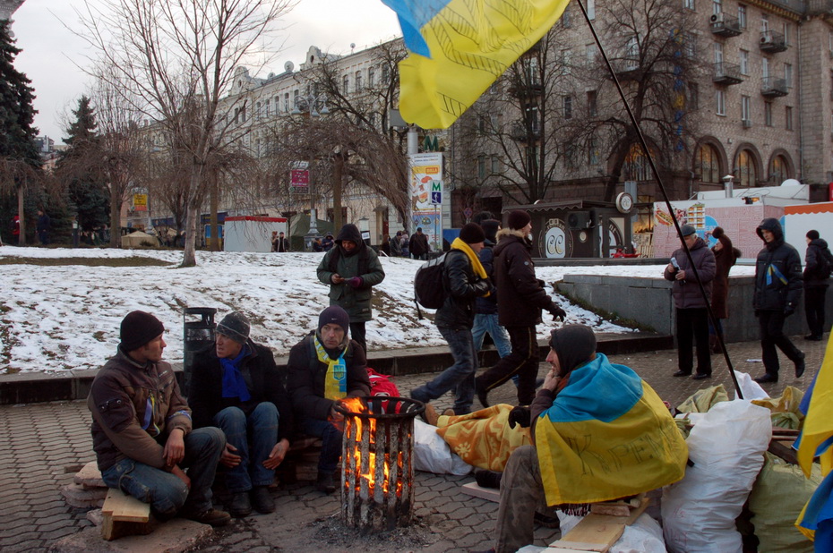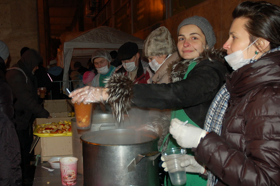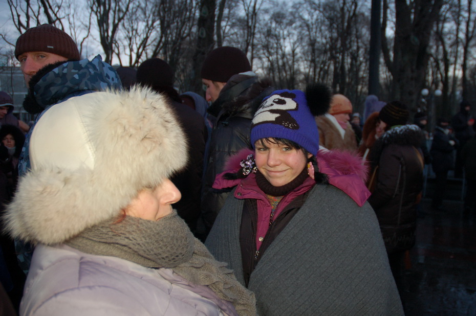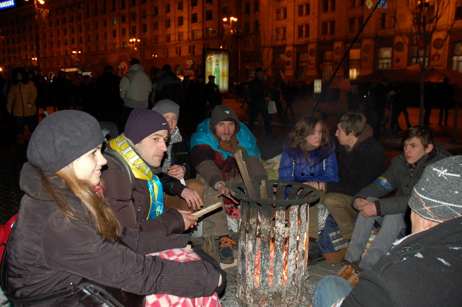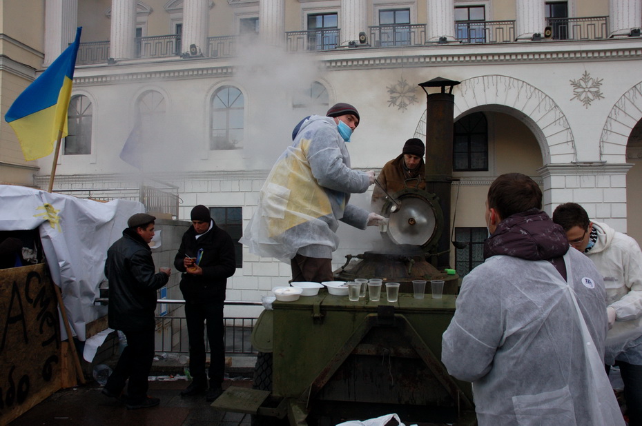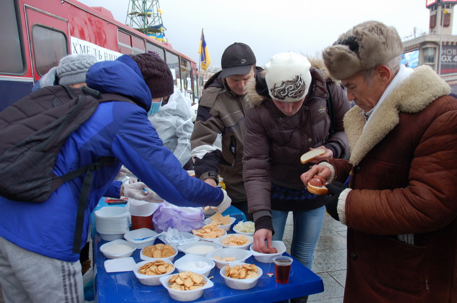 Поздним вечером мне показалось, что я узнаю многих митингующих с Грушевского. Они ужинали, танцевали, слушали речи оппозиционеров с трибуны. К раздаче тёплых вещей подтянулись бомжи. Без проблем.