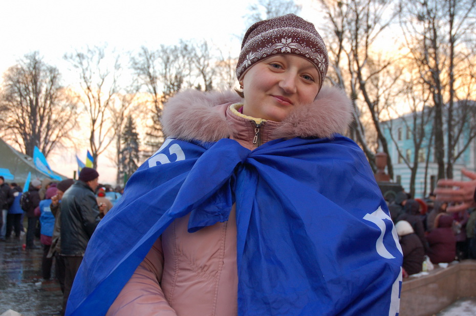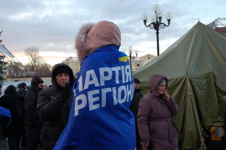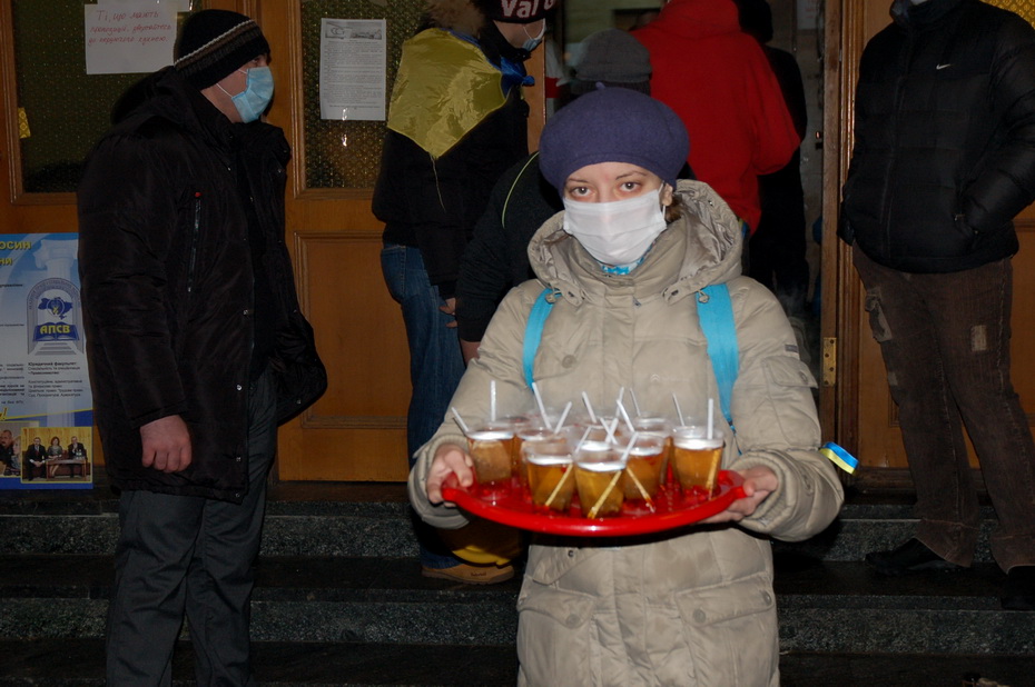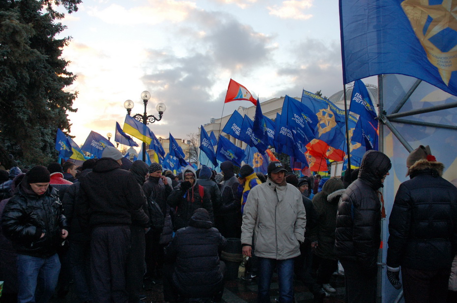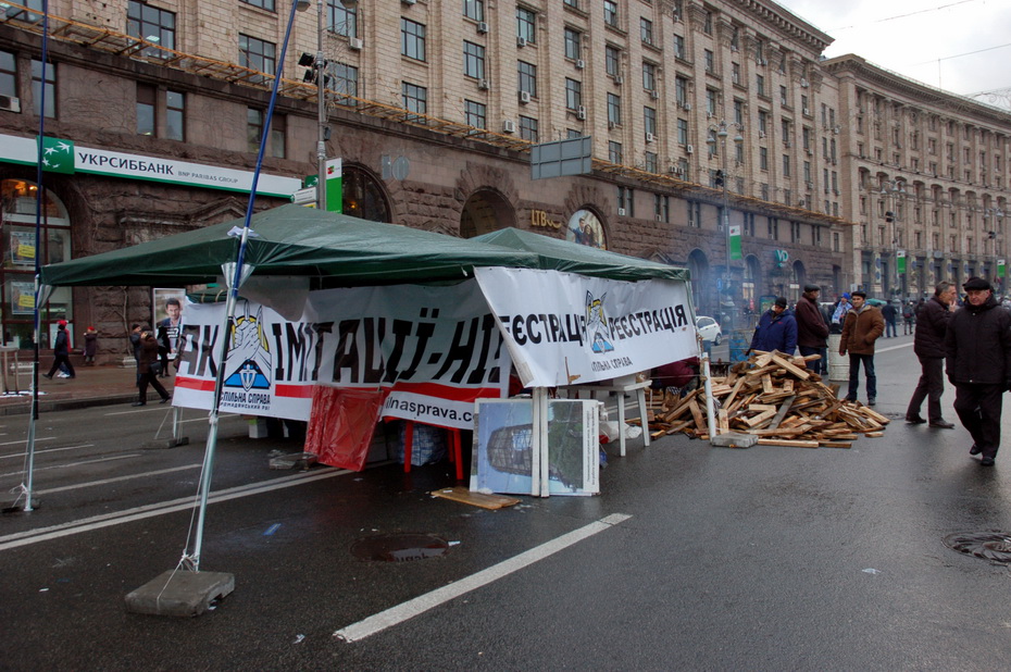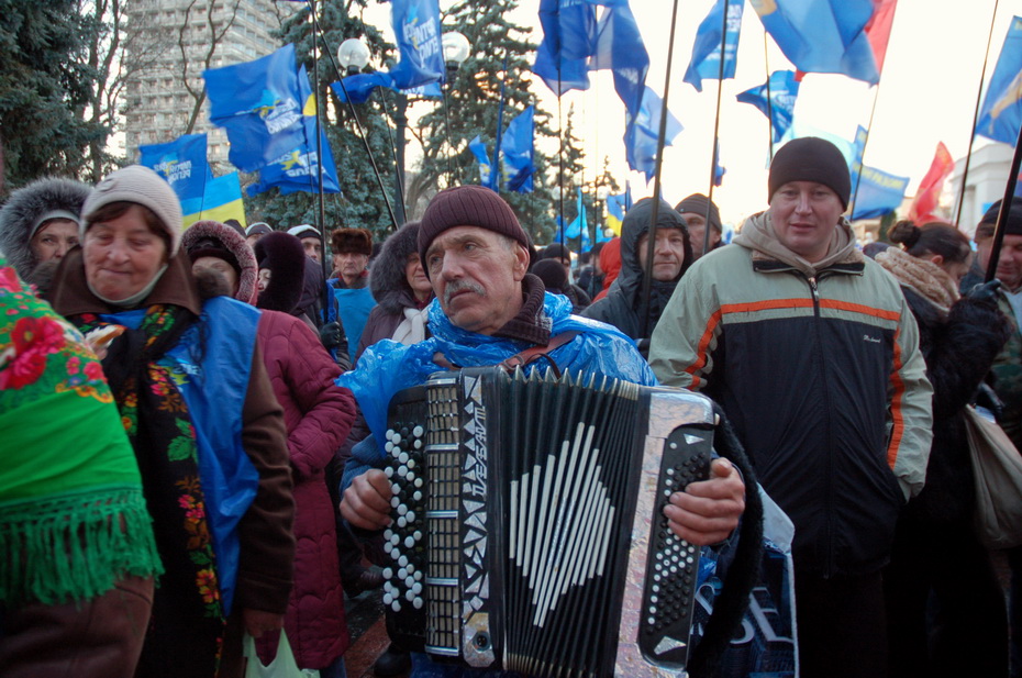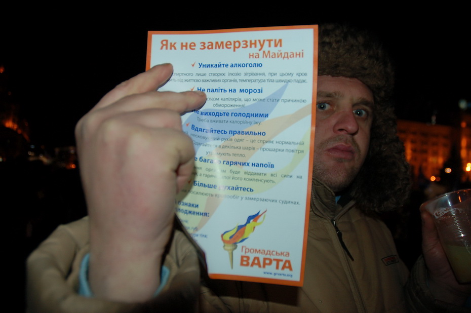 Поздним вечером мне показалось, что я узнаю многих митингующих с Грушевского. Они ужинали, танцевали, слушали речи оппозиционеров с трибуны. К раздаче тёплых вещей подтянулись бомжи. Без проблем.