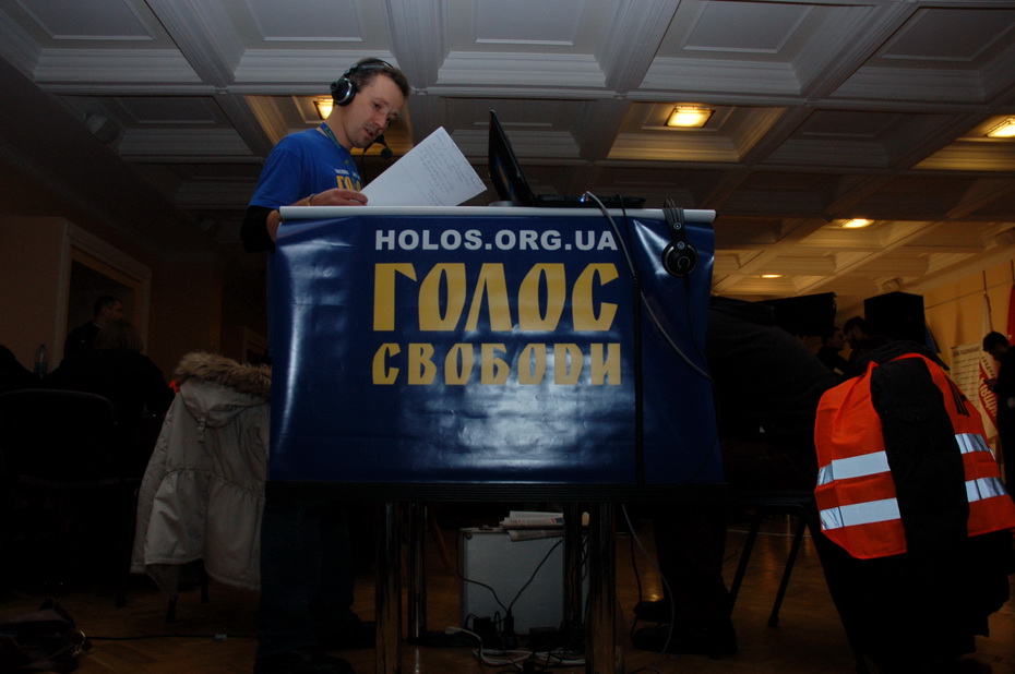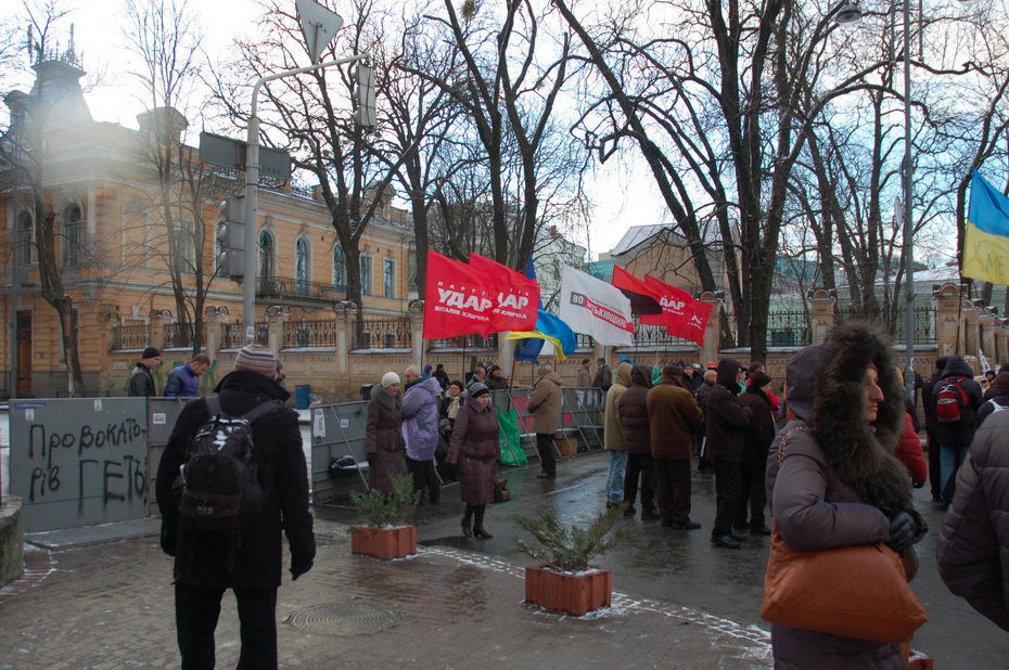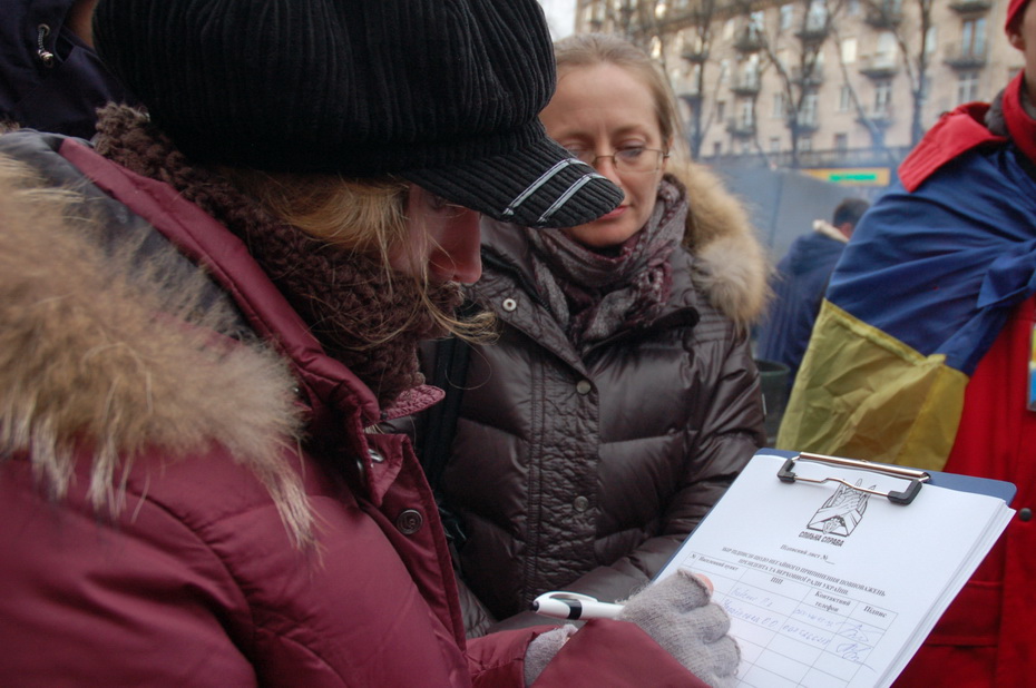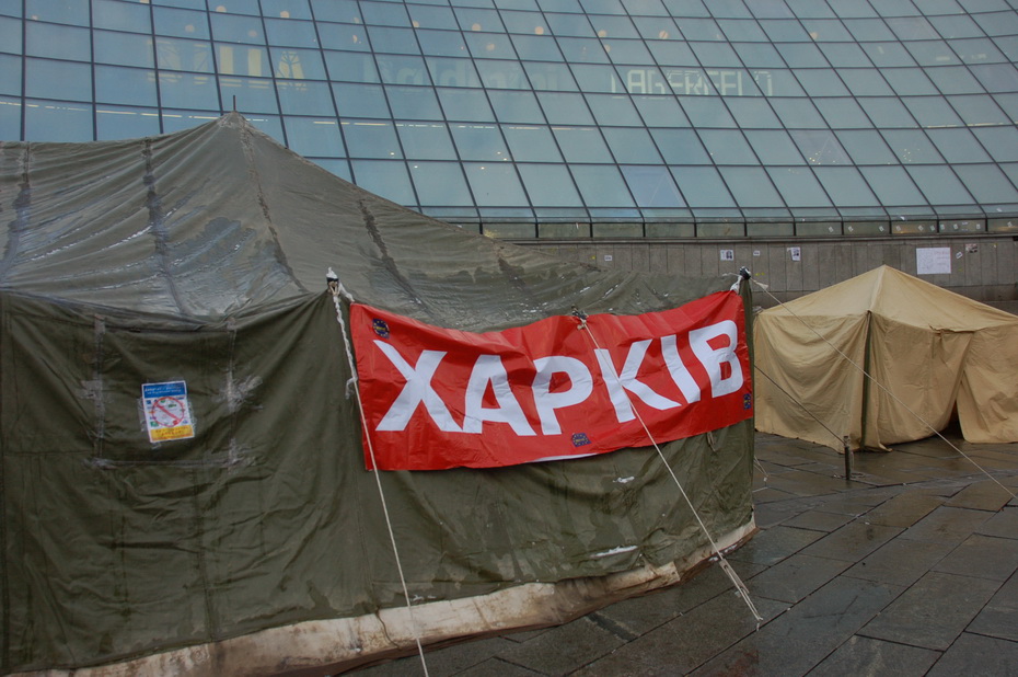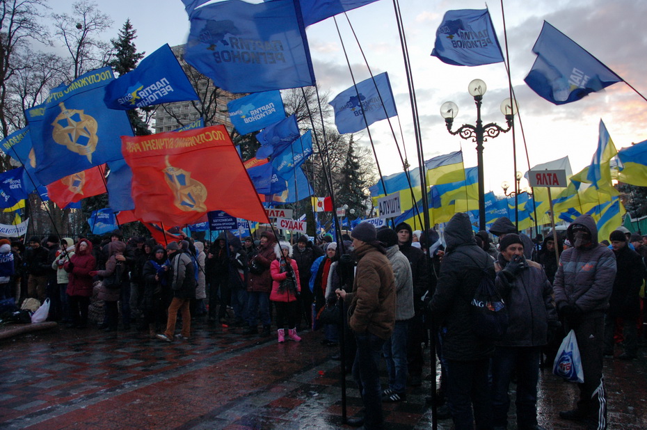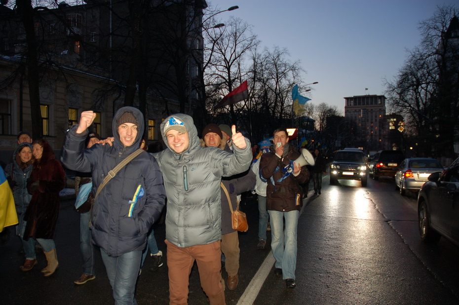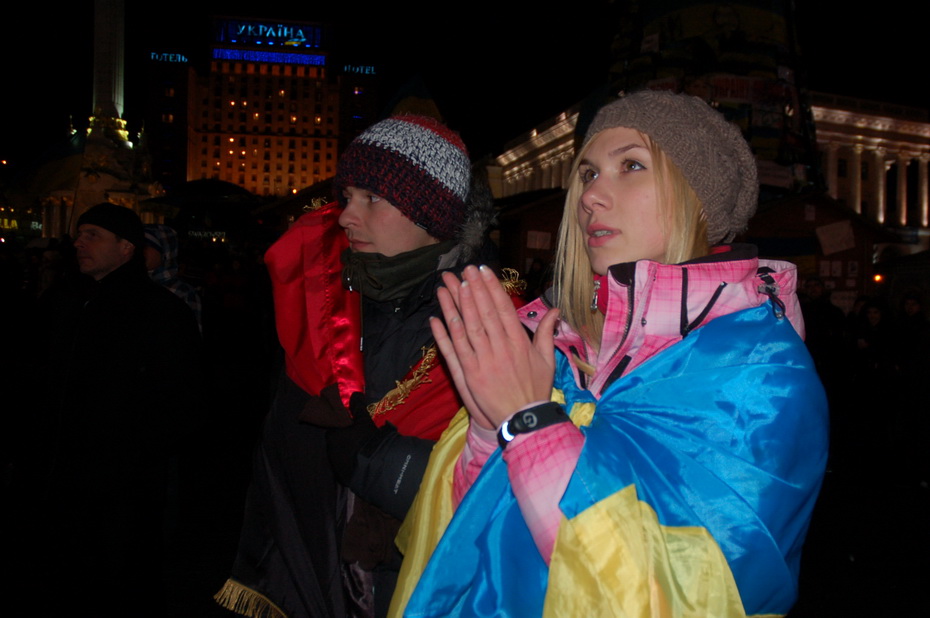 Поздним вечером мне показалось, что я узнаю многих митингующих с Грушевского. Они ужинали, танцевали, слушали речи оппозиционеров с трибуны. К раздаче тёплых вещей подтянулись бомжи. Без проблем.