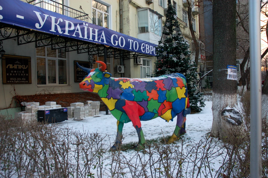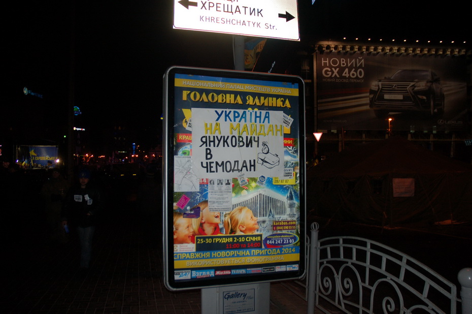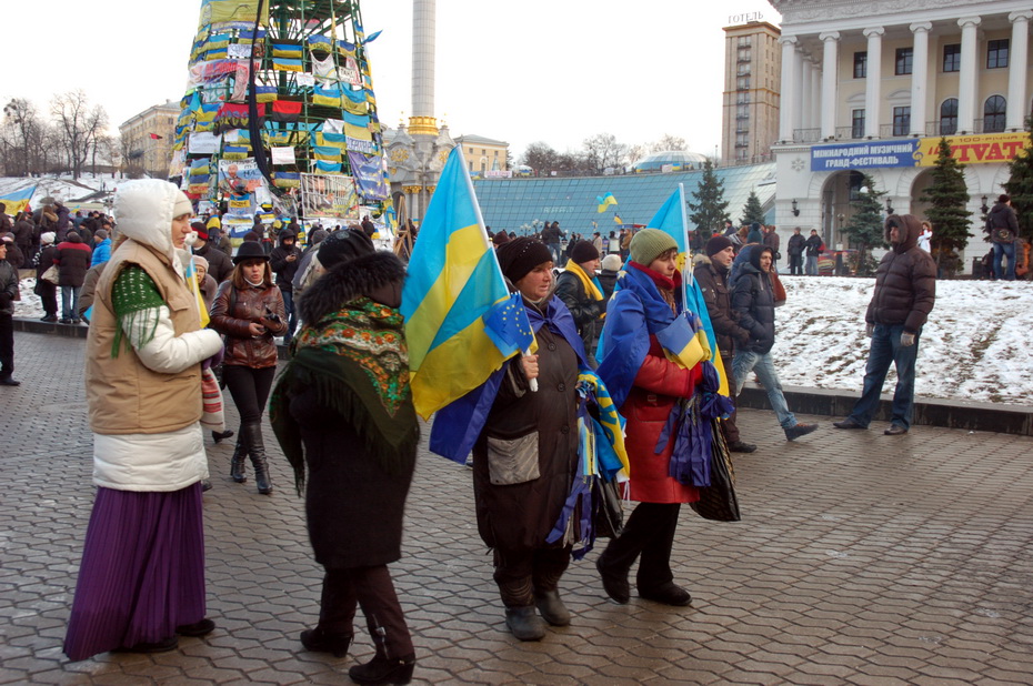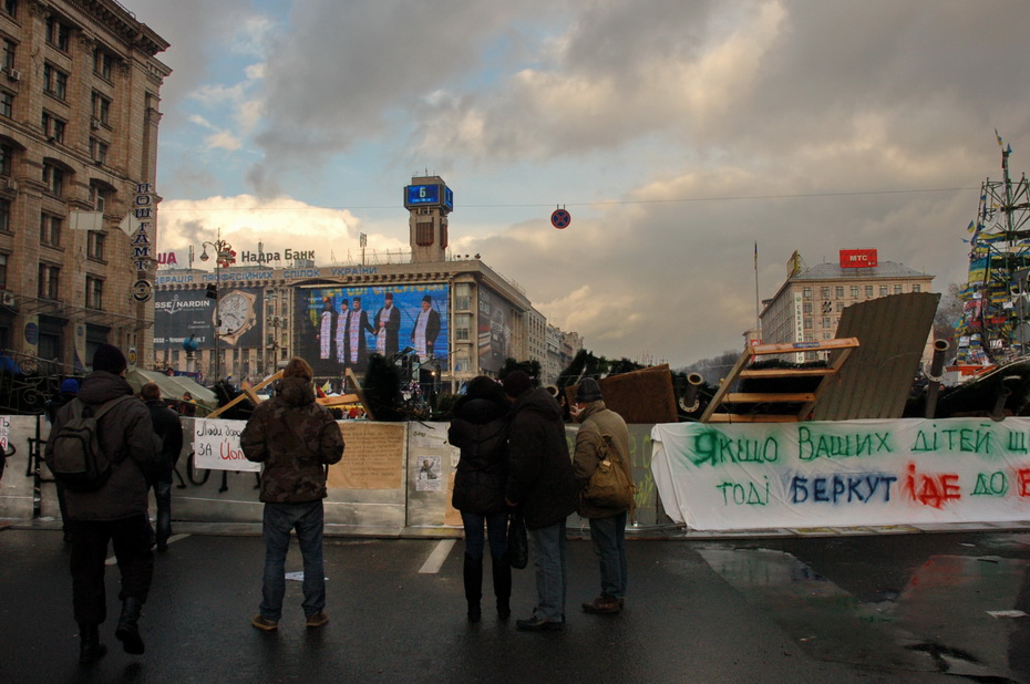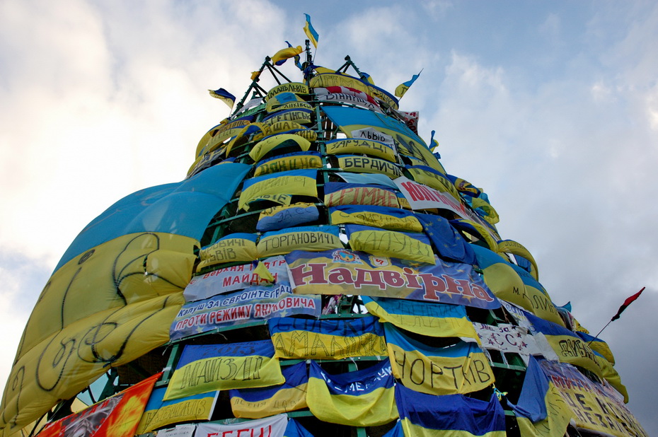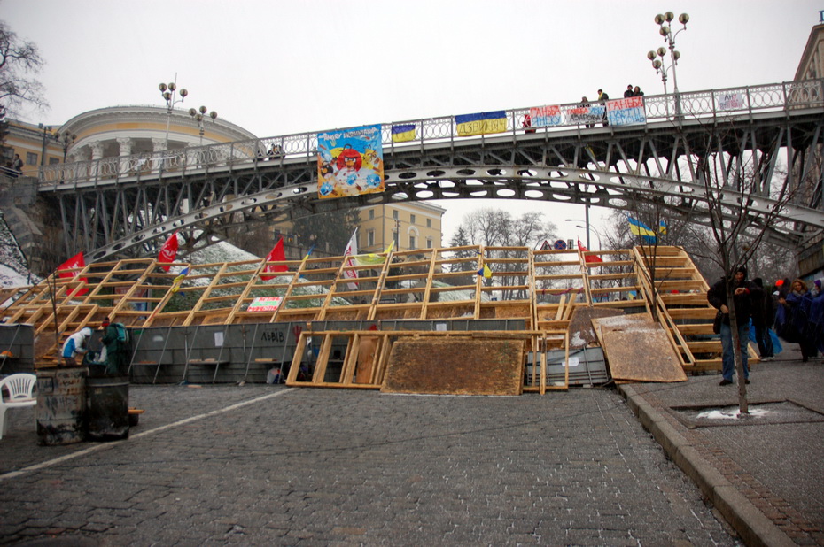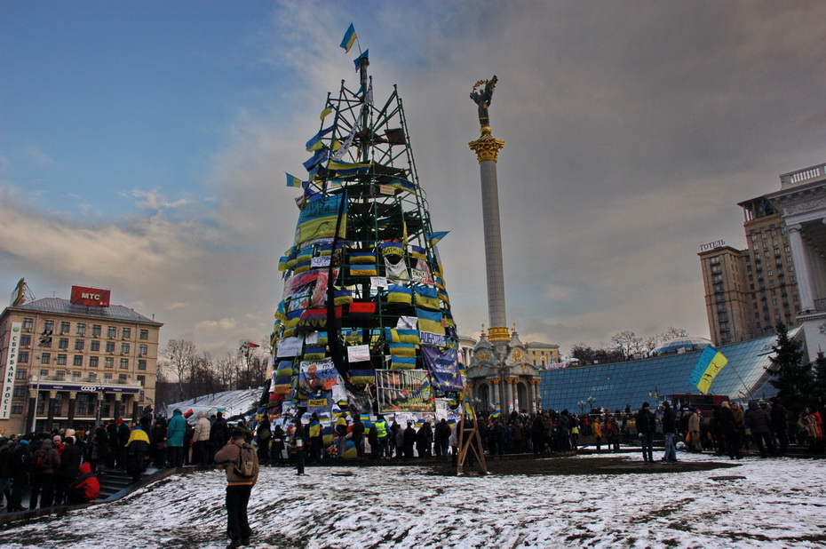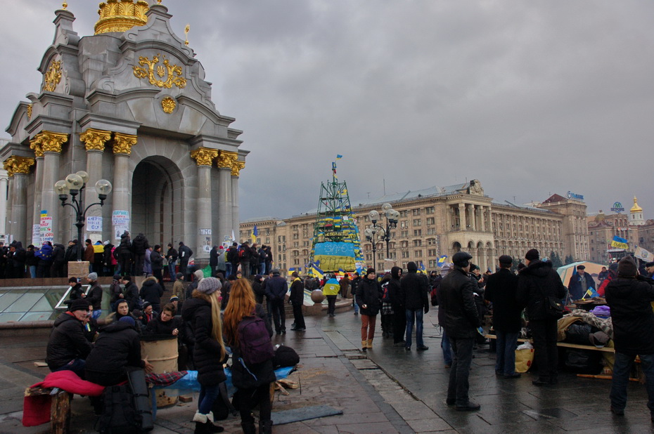 Идём к Майдану. Справа — народная ёлка. Она увешана флагами с названиями городов и областей Украины. Прямо — баррикады. По сути — это доски, фрагменты заграждений и искусственные ветки йолки президентской (в другой транскрипции это слово уже как-то не пишется), которую народ разобрал в праведном гневе. (Процесс избиения студентов бойцы «Беркута» громко, в мегафон, аргументировали подготовкой площади к новогодним гуляниям.)