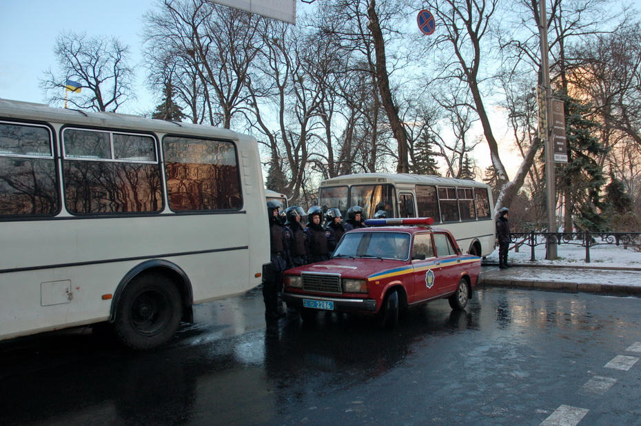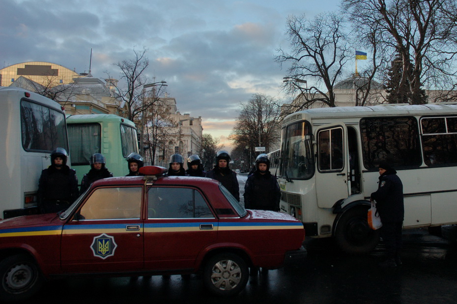 Пришли. Сворачиваем на улицу Грушевского, в Мариинский парк. Слева, за спинами милиционеров, — здание Верховной Рады.