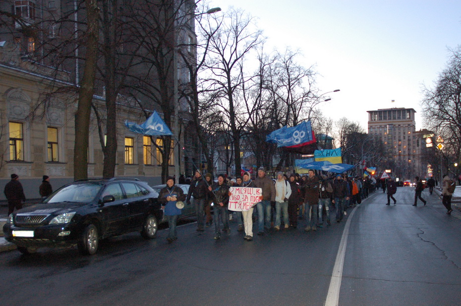 Фотик практически сдох (села батарея). А жаль. Дорога назад, к Майдану Независимости, была интересной. Прямо по проезжей части двигалась огромная колонна громко скандирующих людей. Честно скажу, напряглась. Зрелищно, но страшновато. Перед поездкой я клятвенно обещала шефу не лезть в неприятности. Провокаторов обходить, к бойцам не приближаться. Когда колонна подошла ближе, успокоилась. Свои. Цветные шарфы и кеды 🙂 Лица открыты.