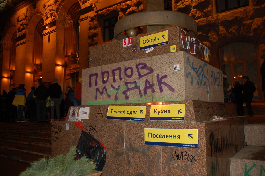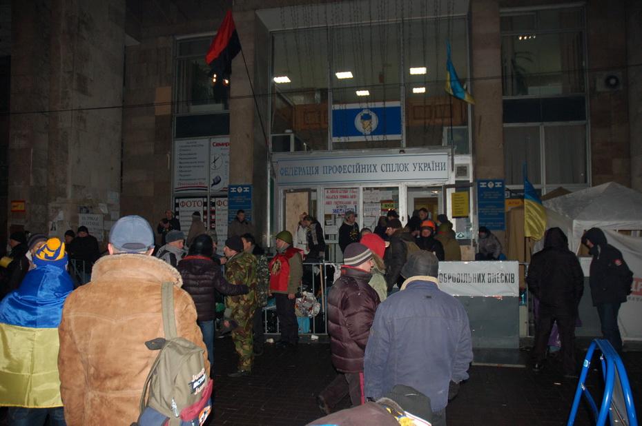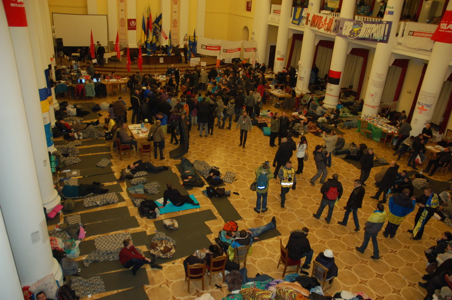 Я пошла заряжать батареи в Дом профсоюзов. Там, на втором этаже, расположился пресс-центр Майдана. Туда приходят спикеры давать интервью. На первом готовят горячие обеды и раздают тёплые вещи. «В штате» есть психологи и юристы. Если что.