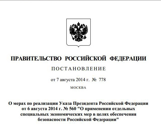 Российское правительство в сегодняшнем постановлении разъяснило, что запрет распространяется на продукты из США, стран Европейского Союза, Канады, Австралии и Норвегии.