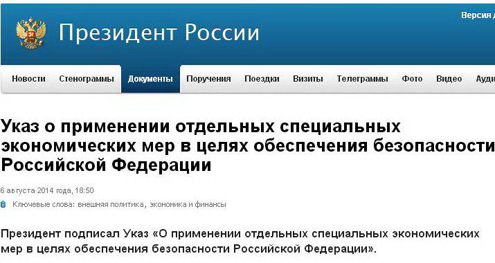 Указ президента России «О применении отдельных специальных экономических мер в целях обеспечения безопасности Российской Федерации» был опубликован накануне.