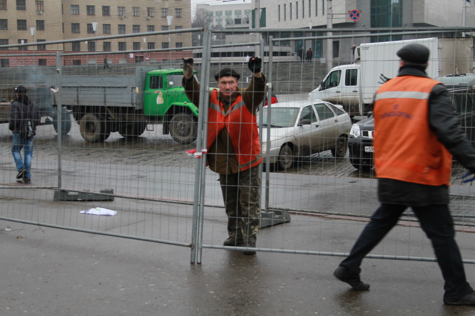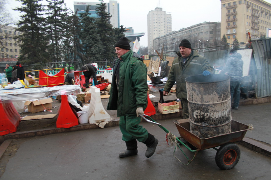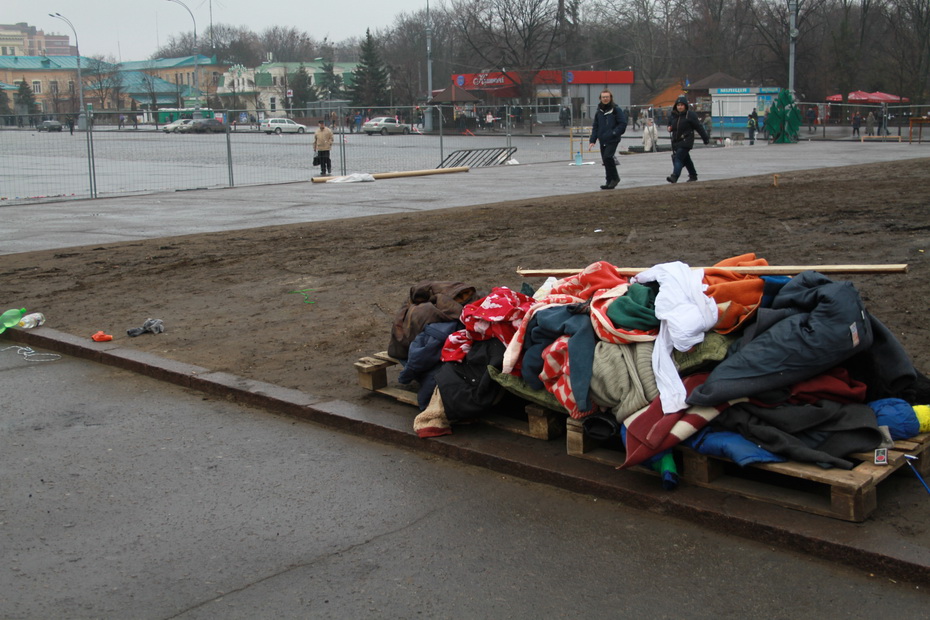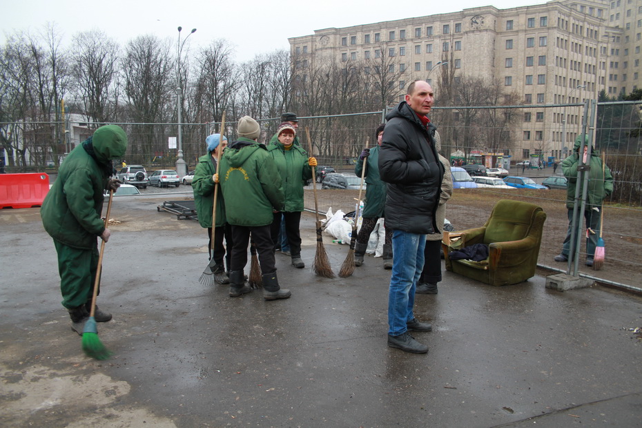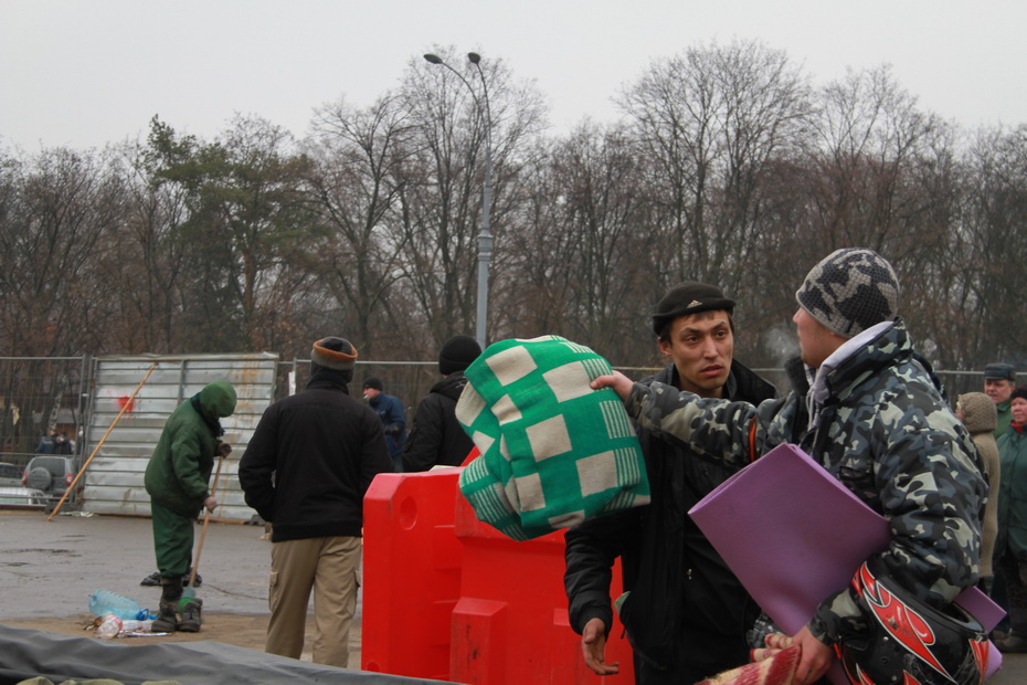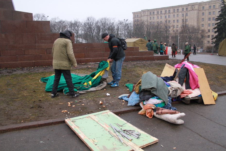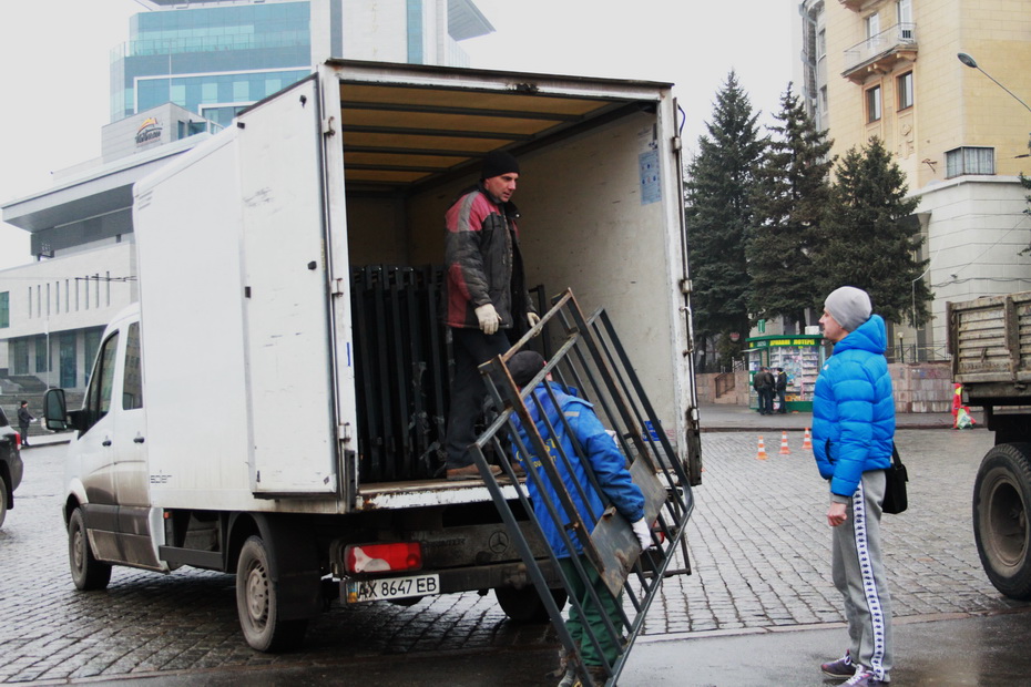 Металлическое ограждение на харьковской площади Свободы разбирают и вместе с металлическими бочками грузят в машины. «Жители» лагеря собирают и вывозят свои палатки и вещи.