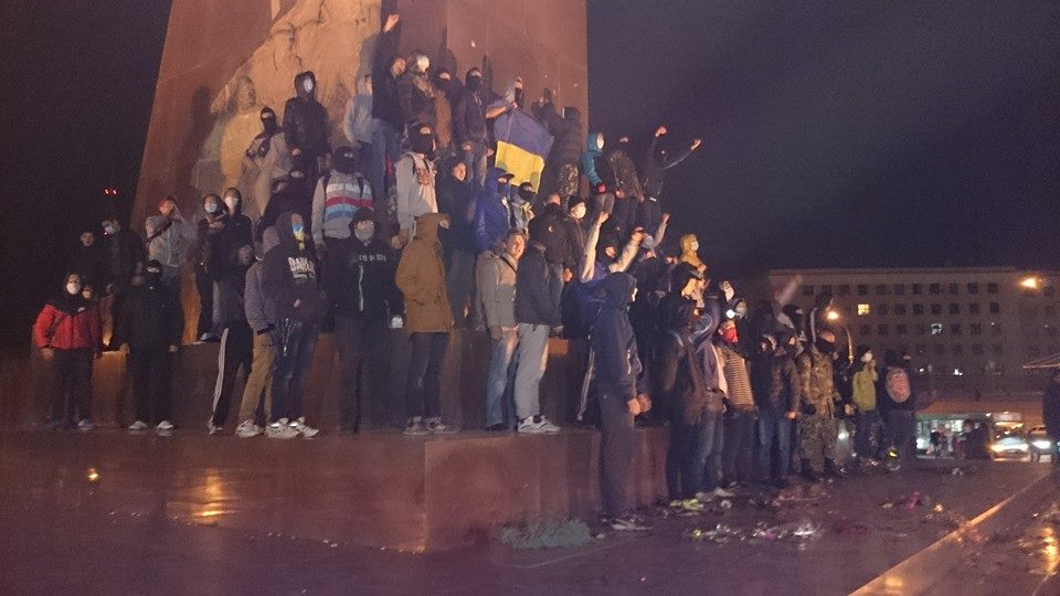 Памятник Ленину на площади Свободы снесли вечером в воскресенье, 28 сентября. Участники протеста — в том числе, представители движения «ультрас», люди с символикой батальона «Азов» и организации «Патриот Украины» — сначала с помощью перфоратора высекли на гранитном постаменте надпись «Слава Украине», а затем с помощью «болгарки» начали пилить части скульптуры. Милиция противникам вождя не препятствовала.