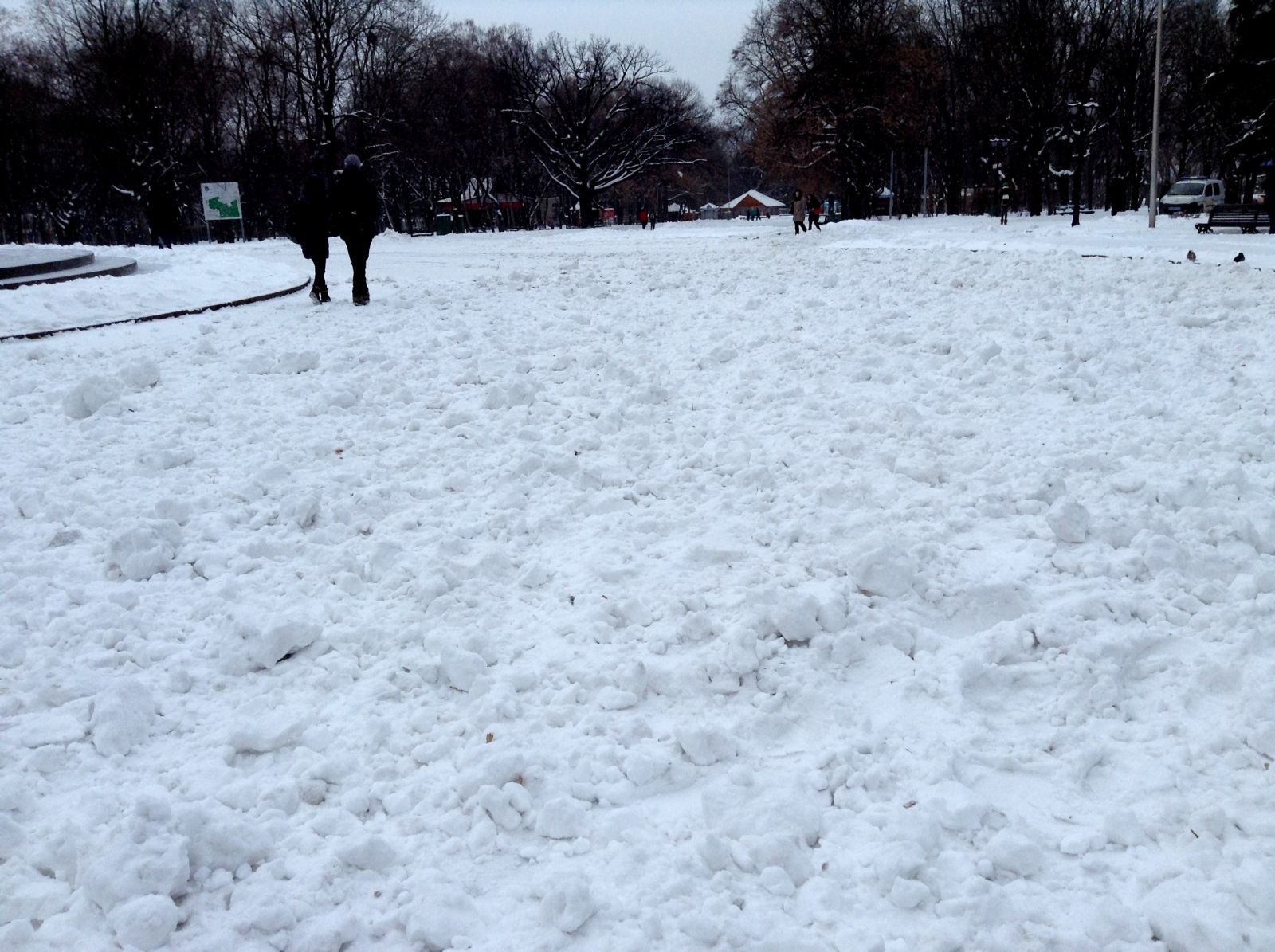 Сегодня днём к памятнику Шевченко в Харькове, где ежедневно проходит местный Евромайдан, несколько тракторов с прицепами доставили снег. Коммунальщики разбросали его на площадке вокруг монумента, которую прежде они же от снега почистили. Сотрудники КП «Харьковзеленстрой» говорят: снег вернули, «чтобы не было скользко».