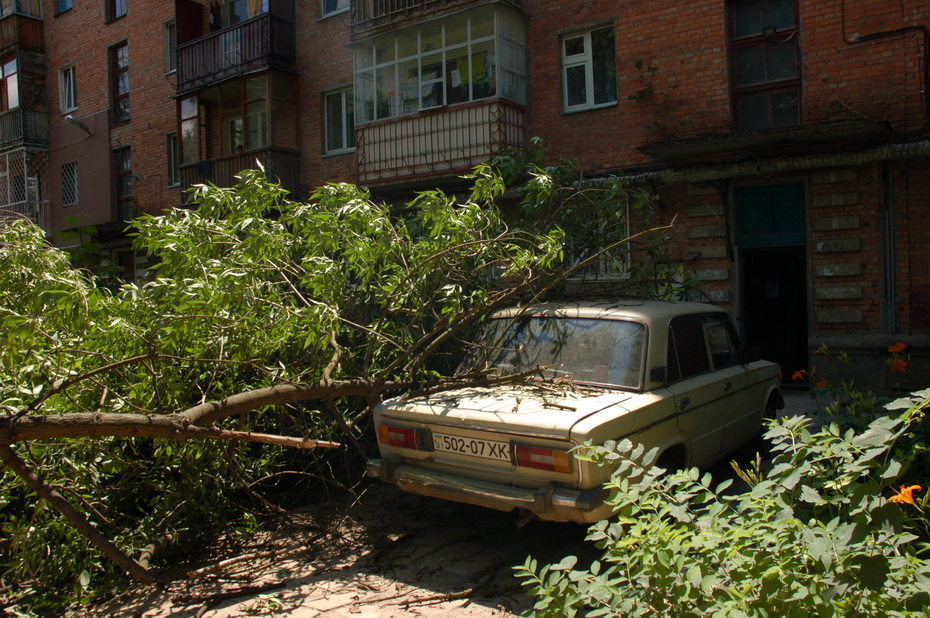 Чуть больше повезло соседу Максима — ветка зацепила его автомобиль верхушкой. Повреждено крыло.