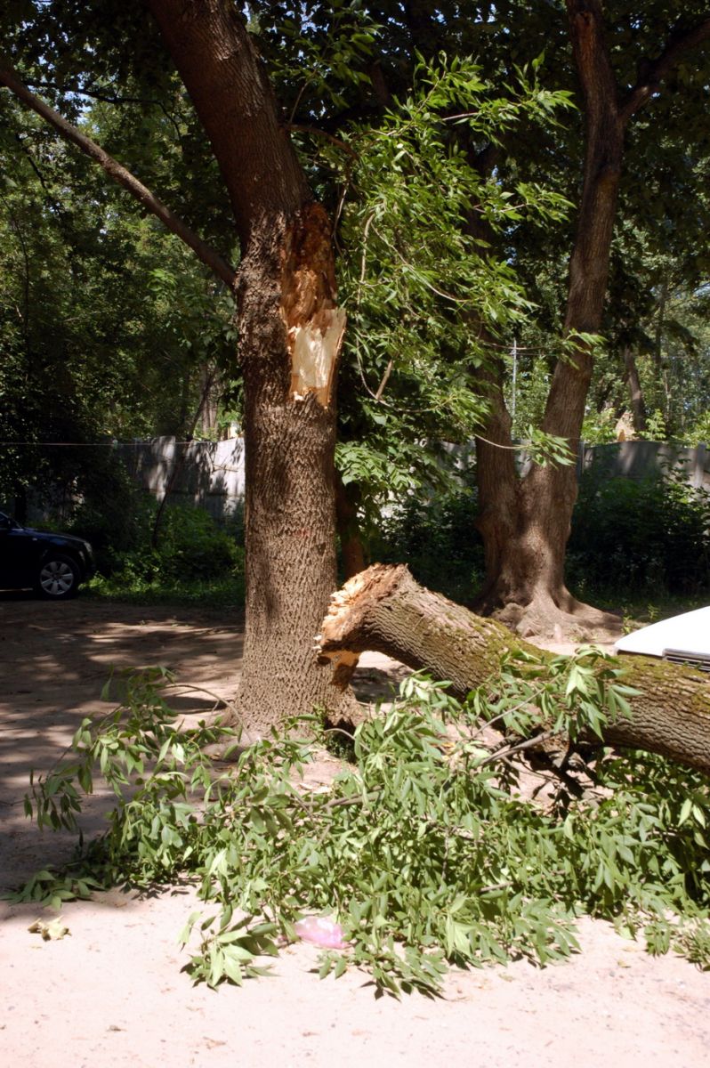Во дворе дома №7 по улице Тринклера упала огромная ветка дерева. В результате пострадали два автомобиля «Жигули».